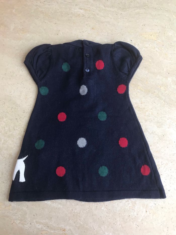 ROBE DE LA MARQUE "MAYORAL". Coloris : Bleu marine. Taille : 6 mois Encolure arrondie. Noeud décoratif cousu à l'avant de l'encolure. Fermeture par une boutonnière (3 boutons) à l'arrière. Pompon du bonnet et noeud du chien avec médaille cousus sur le motif de l'avant. Manches courtes. Matière : l'étiquette intérieure mentionnant la matière a été découpée mais je dirais un mélange de laine, de coton et d'élasthanne. D'occasion en très bon état (pas de taches, ni de trous ou d'accrocs).