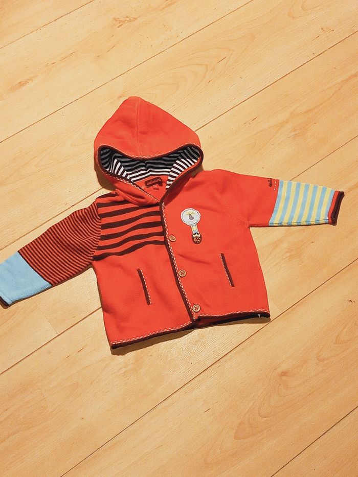 Superbe cardigan avec capuche rouge taille 12 mois/74cm Acheté neuf et en très bon état 100% coton, 1 bouton de rechange