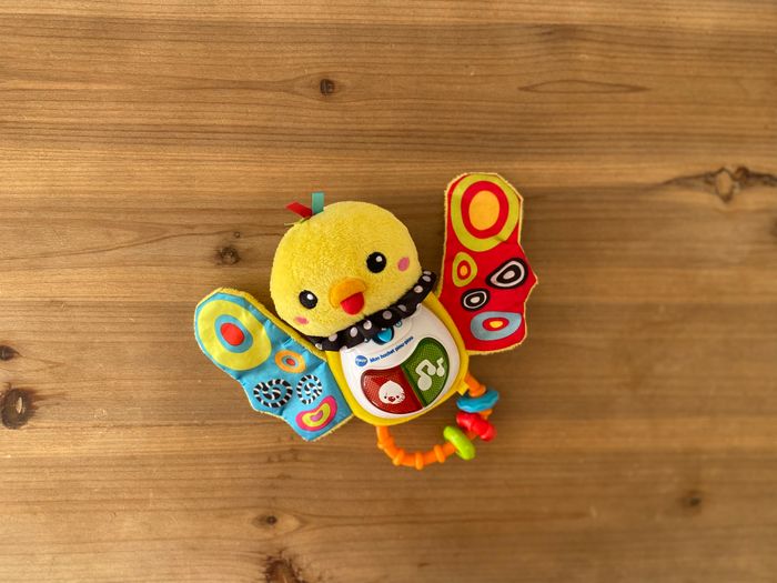 Bébé l’attrapera facilement grâce à sa poignet. Un petit oiseau aux couleurs vives qui chante et qui parle. Très pratique on peut détacher la boîte électronique et laver l’oiseau en machine. vtech14