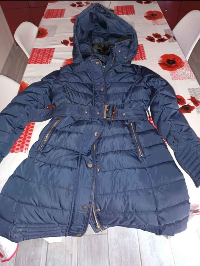 Bonjour, Très beau manteau Chaud bleu marine, excellent état comme neuf. La capuche peut s'enlever et la ceinture est réglable.. Marque Aomanxi.