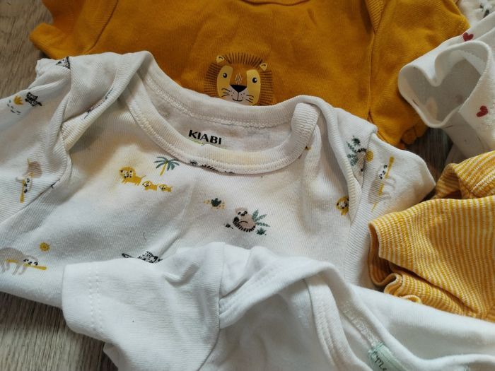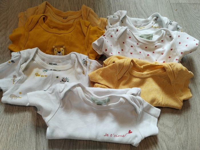 7 bodies manches courtes et 4 bodies manches longues en 6 mois Kiabi, Pommette, Bout'chou, Mes p'tits cailloux Petite tâche sur un body Kiabi photo 3 (son doublon n'est pas tâché)