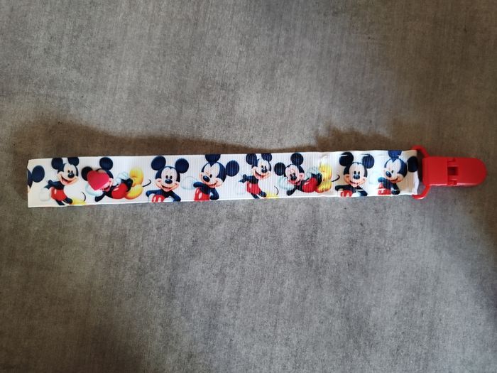 Attache tétine Mickey faisant 22cm. Elle peut passer au lave linge ou peut se mettre à trempé car il n'y a aucune partie métallique dedans. Jamais utilisée