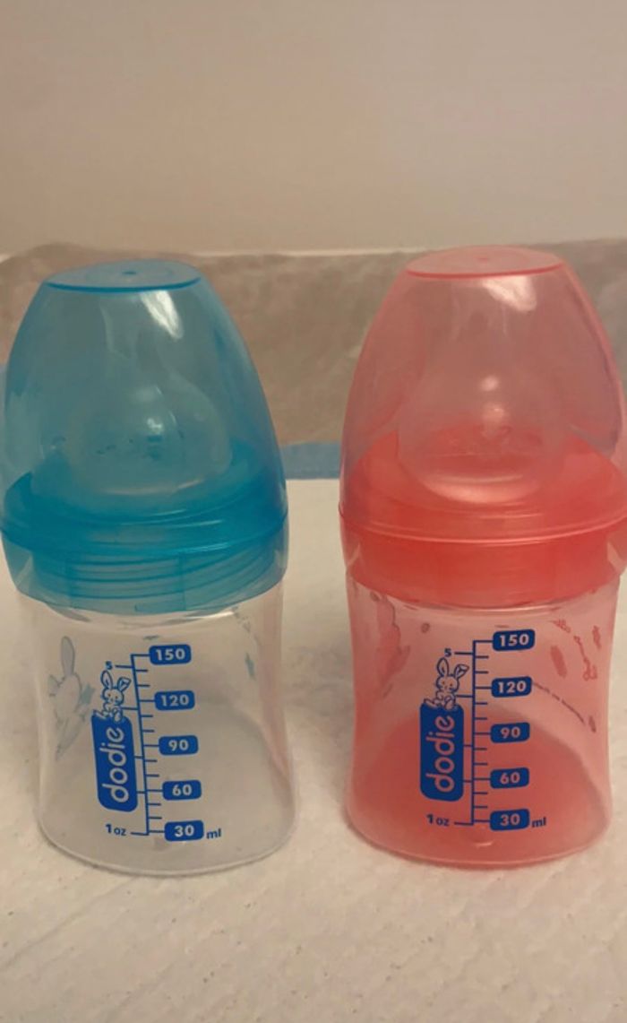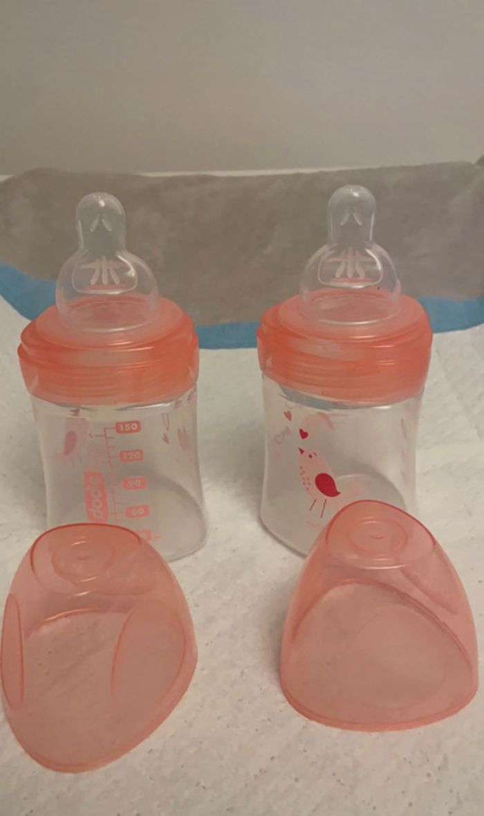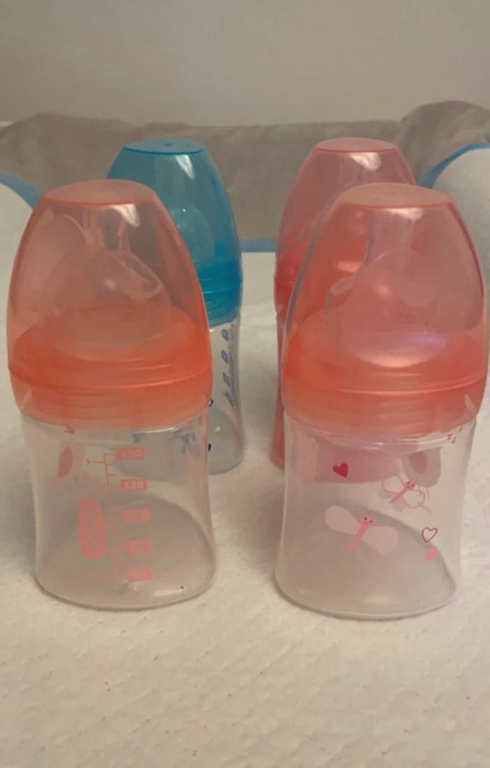 Vend lot de 4 biberon 150ml Marque Dodie 2 avec tétines anti colique 2 avec tétines 3 vitesses Utiliser une seule fois puis stérilise car bébé ne prend que la marque NUK