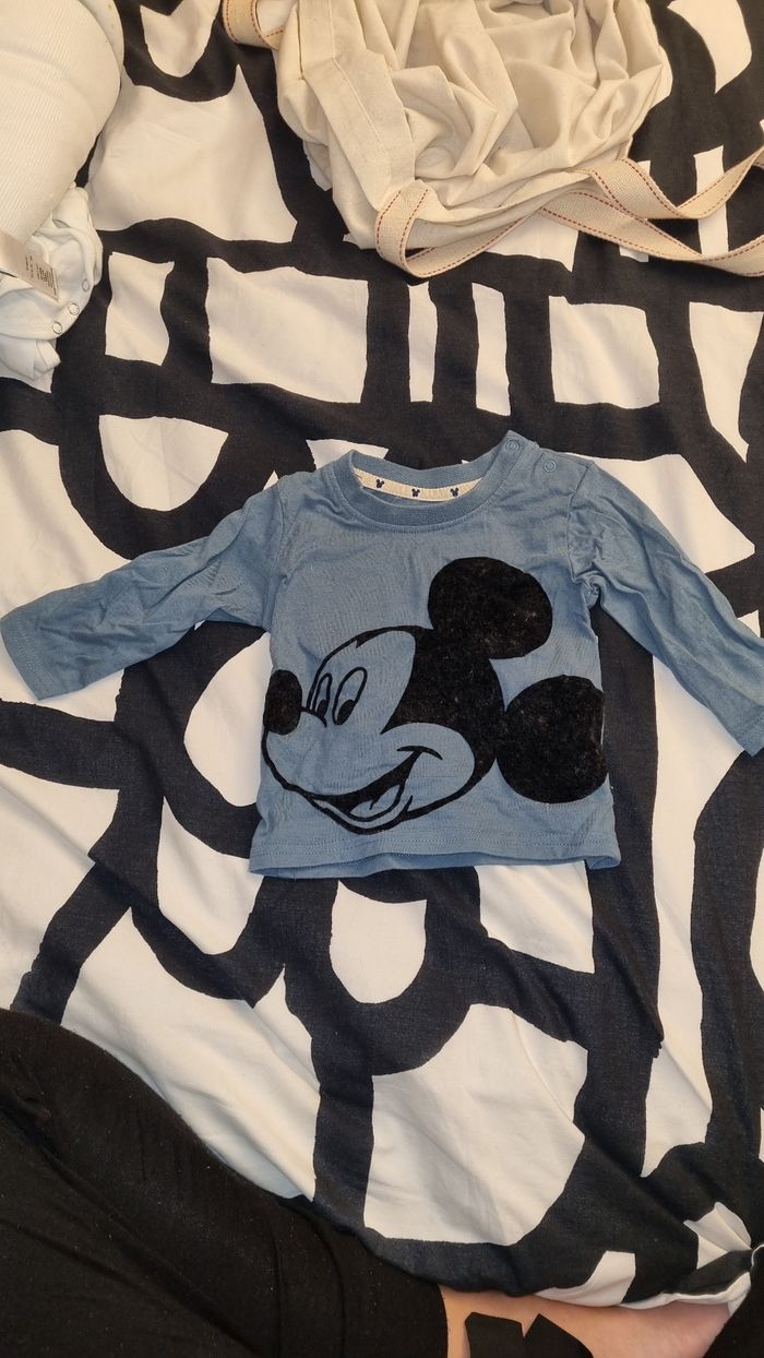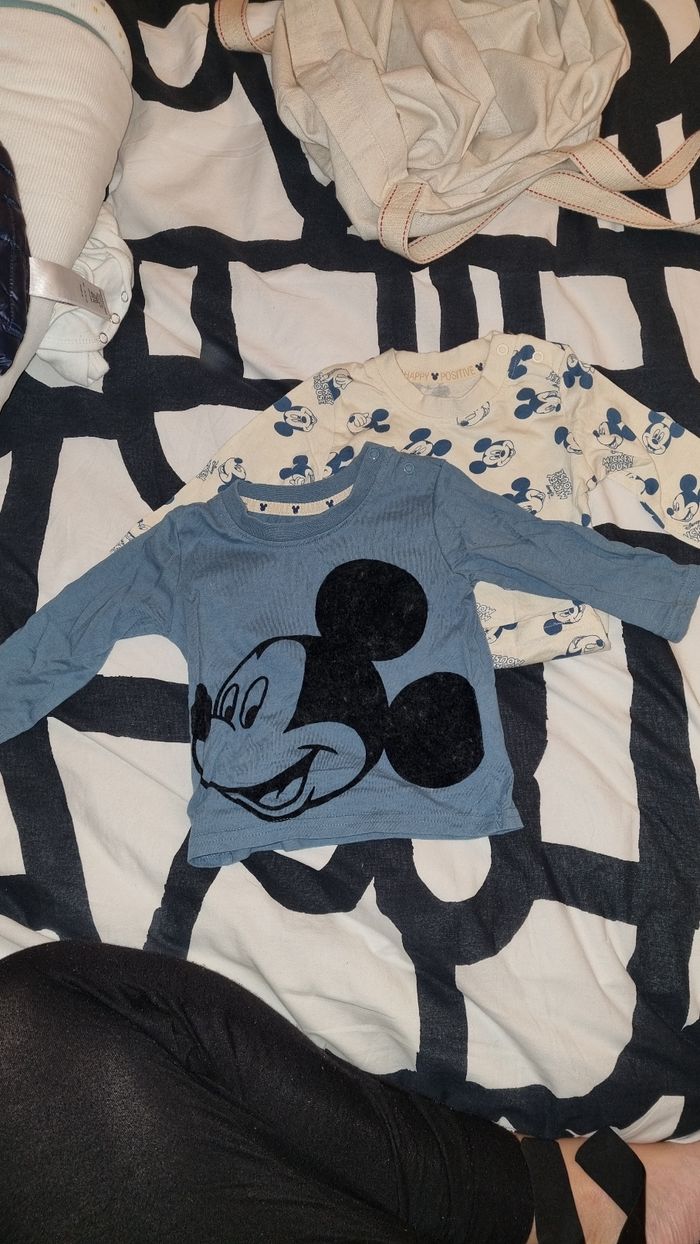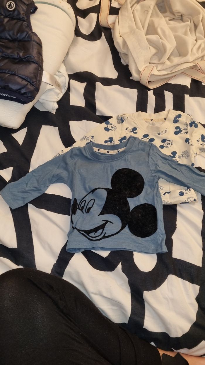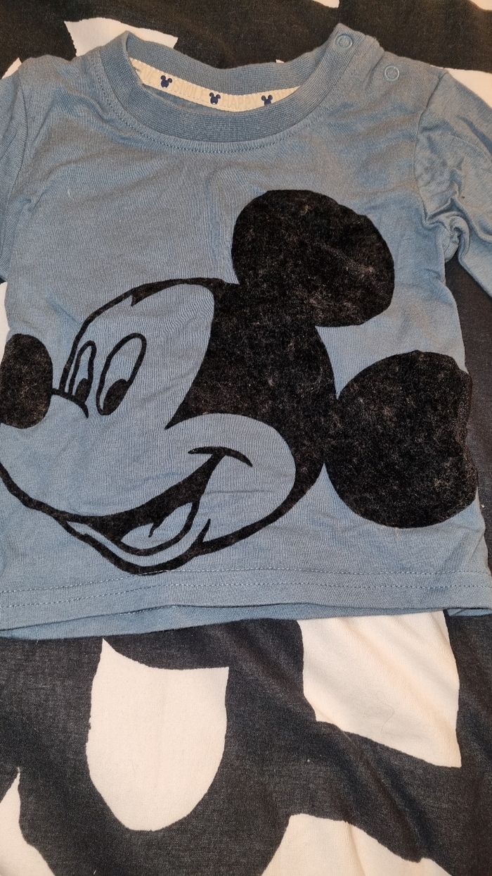 Porté quelques fois Taille 3-6 mois ( 68 cm) Le teeshirt bleu a un mickey avec une matière en velour, des peluches se sont accrochés au lavage