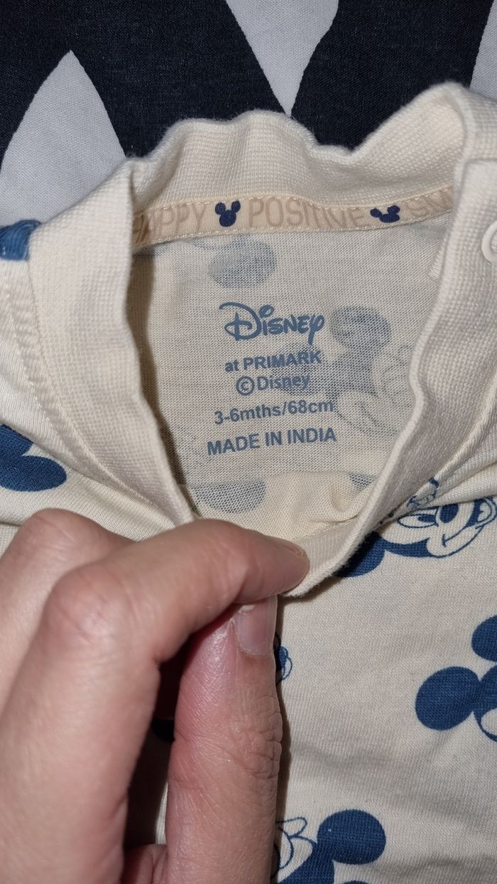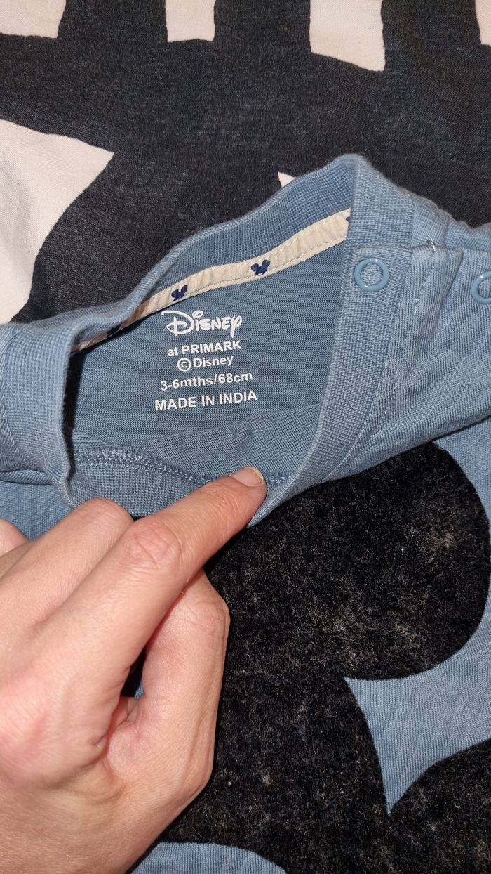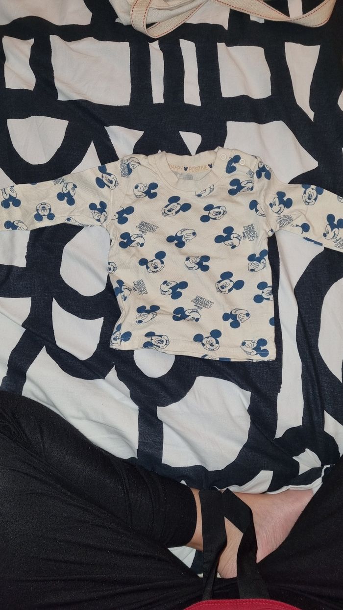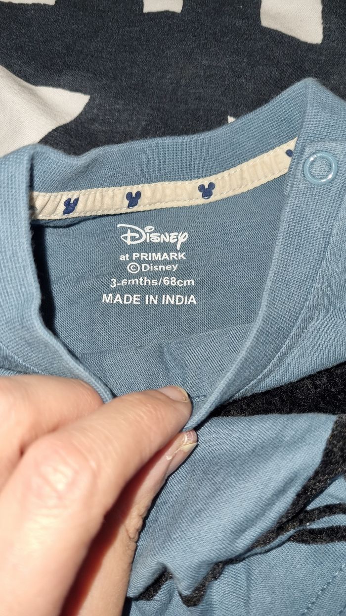 Porté quelques fois Taille 3-6 mois ( 68 cm) Le teeshirt bleu a un mickey avec une matière en velour, des peluches se sont accrochés au lavage