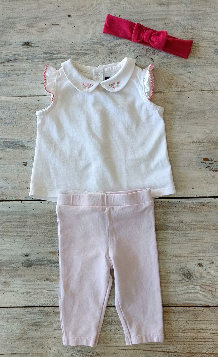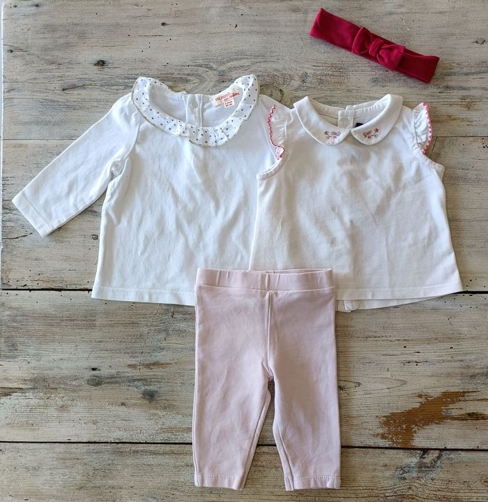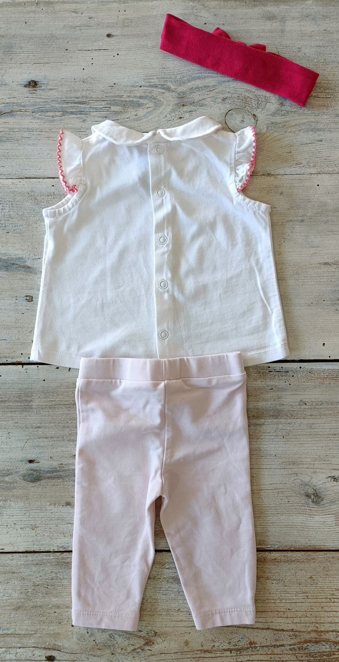 Ensemble 3 mois composé d'un legging rose pâle marque tape à l'oeil ; d'un tee-shirt manches longues blanc marque du pareil au même ; d'un tee-shirt manches courtes col claudine marque Sergent major et un bandeau fushia. Le tout en très bon état.