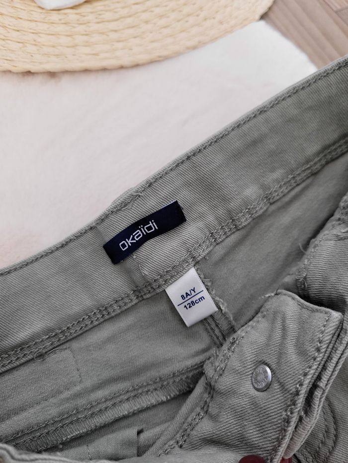 short en jeans okaidi 8 ans, kaki et bande irisée, fermeture pression et élastique d'ajustement