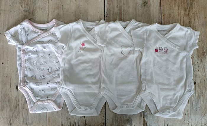 Lot 4 bodies manches courtes, marque Orchestra, en très bon état, taille 1 mois. Ouverture sur le devant pour les 4, très pratique.