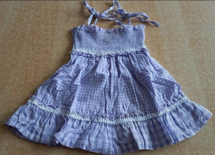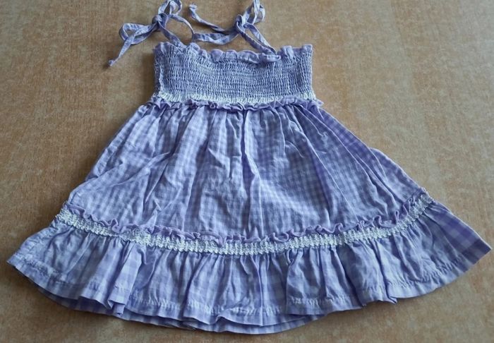 - Robe à smocks, couleur vichy parme/blanc, en bon état. - Robe violette à volants, marque Influx, en très bon état. Taille 3 mois.