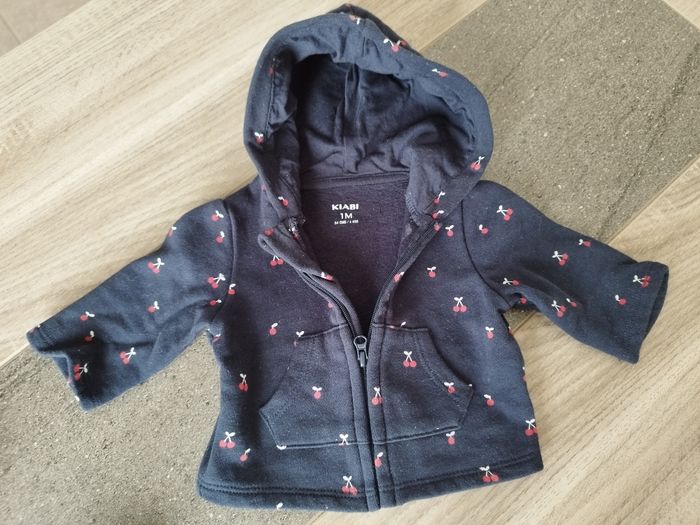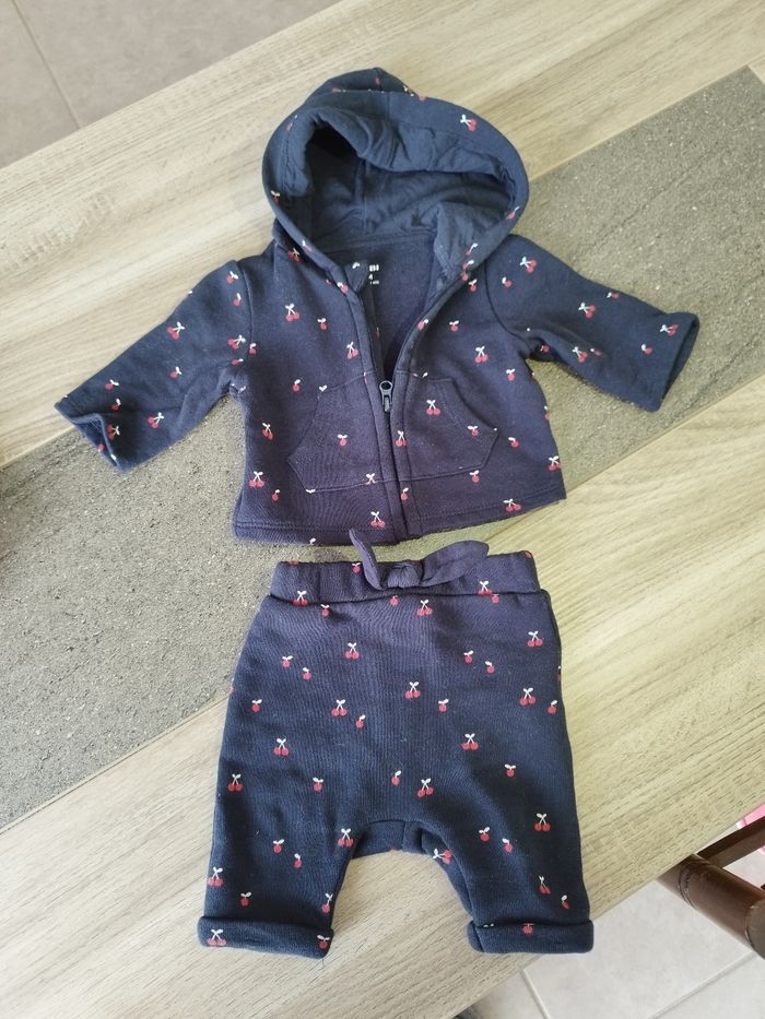 Ensemble pantalon et veste à capuche bleu marine avec motifs cerise 🍒. Peu porté.