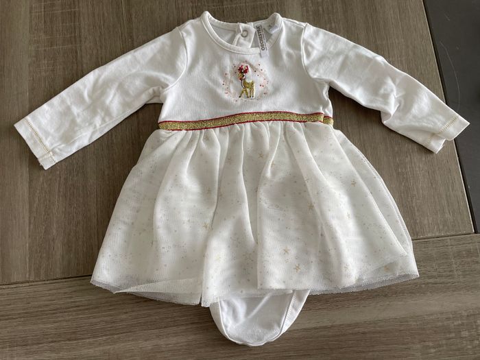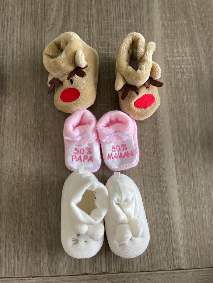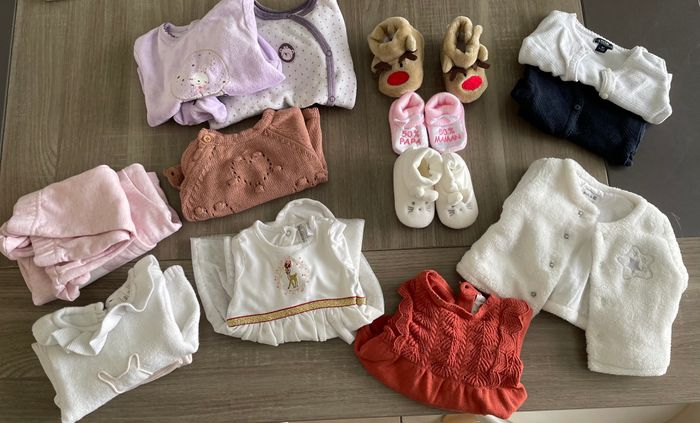 Petit lot habit 1 mois - 3 paires de chaussons - 1 robe C&A et 1 robe orchestra - 1 manteau fourrure - 2 gilets Kiabi - 1 pull Verbaudet - 1 ensemble orchestra et 1 ensemble InExtenso - 2 pyjamas Très bon état !