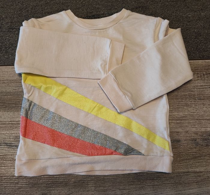 Sweat rose pâle neuf. Rayures pailletés de couleur jaune, grise et rose.
