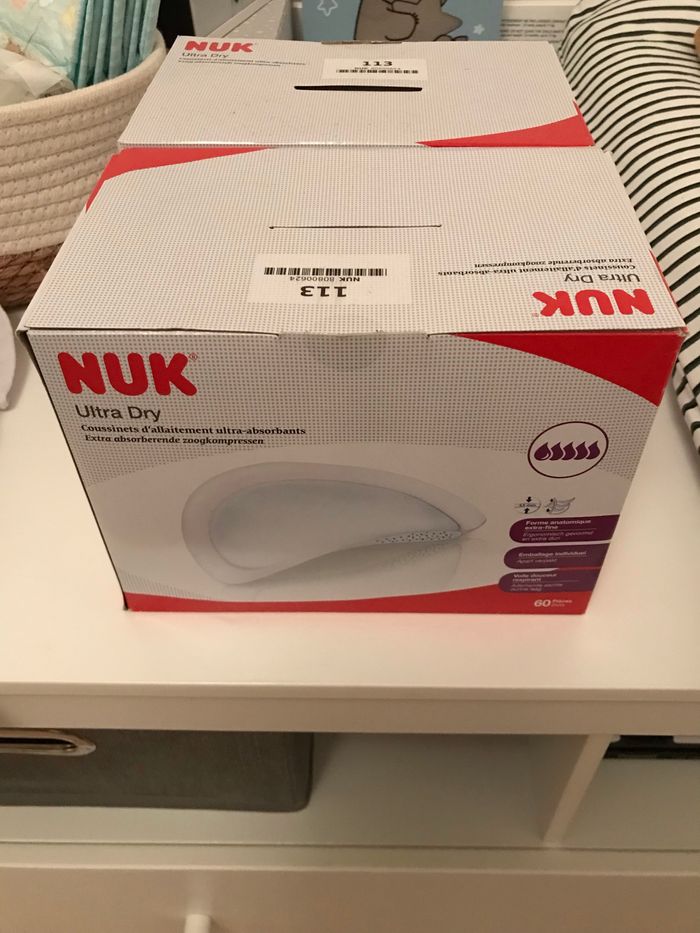 Vends coussinets d’allaitement. 1 boîte neuve 60 pièces et 1 boîte ouverte 58 pièces. (Essayer mais allaitement pas possible). Très bon état, neuf. Chaque coussinets et individuel et ferme par un plastique.