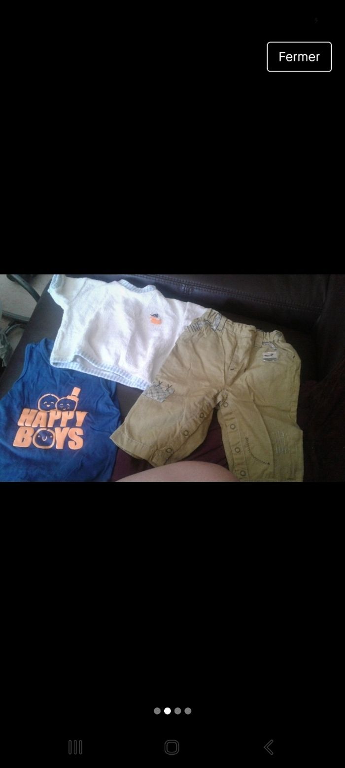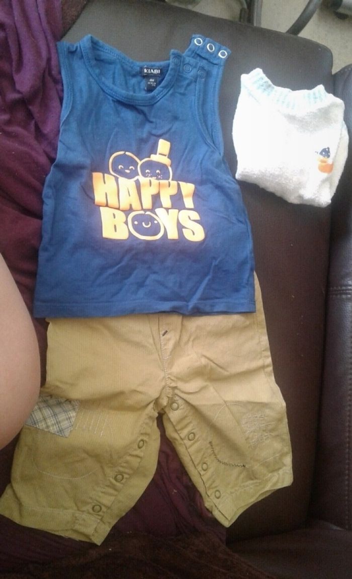 Tshirt happy boys kiabi 6mois tbe Pantalon kaki sergent major 6 mois Offert un petit pull en état satisfaisant Ensemble pantalon tshirt garçon