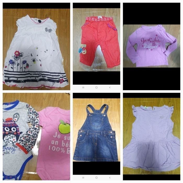 Lot composé de : - 3 robes - 2 bodies - un leggings - un tshirt - un gilet epais - 3 paires de chaussettes - 2 bonnets Le pantalon rouge ne fait plus partie du lot