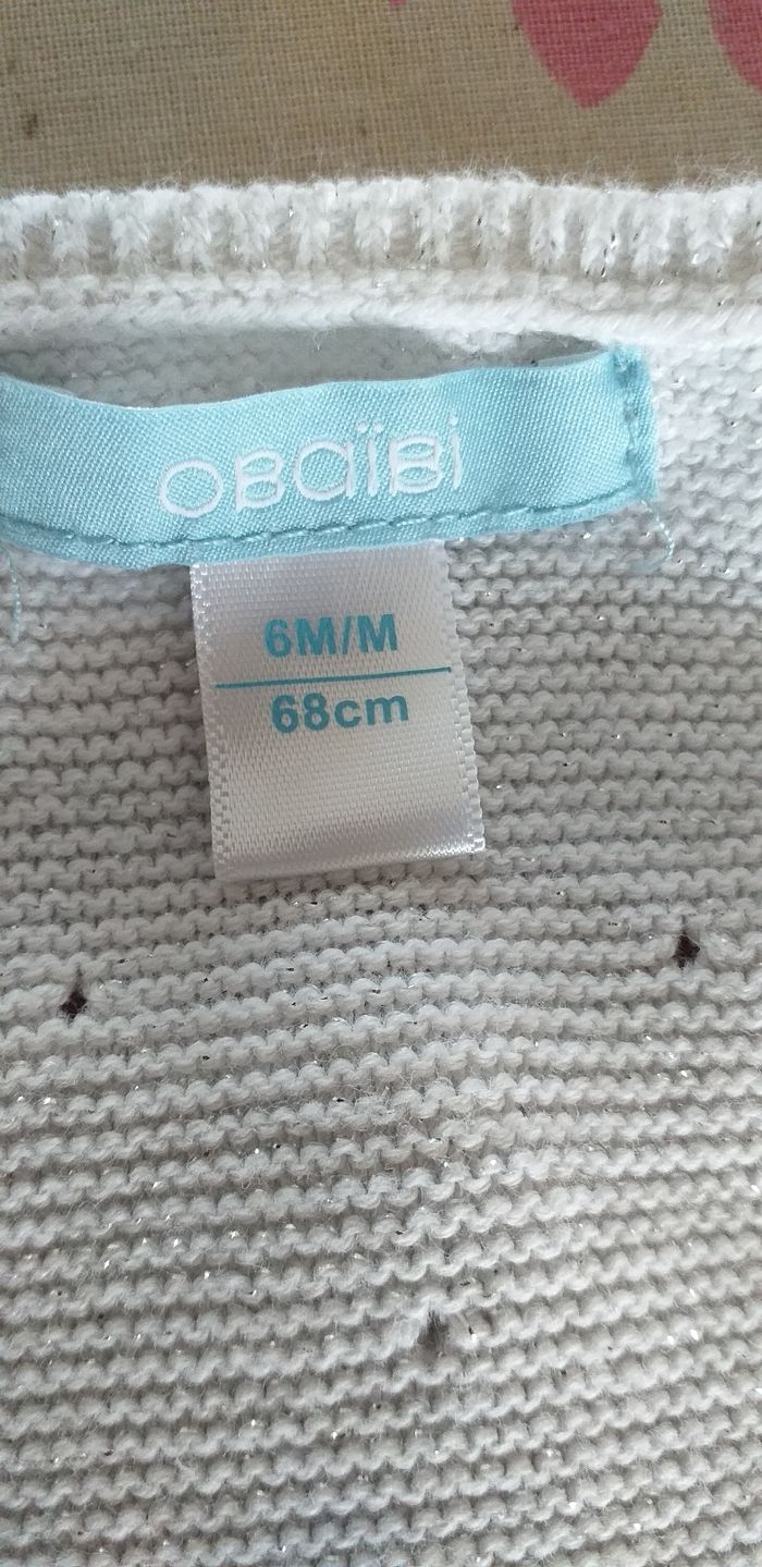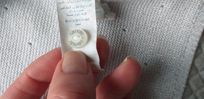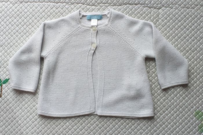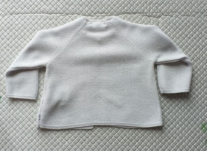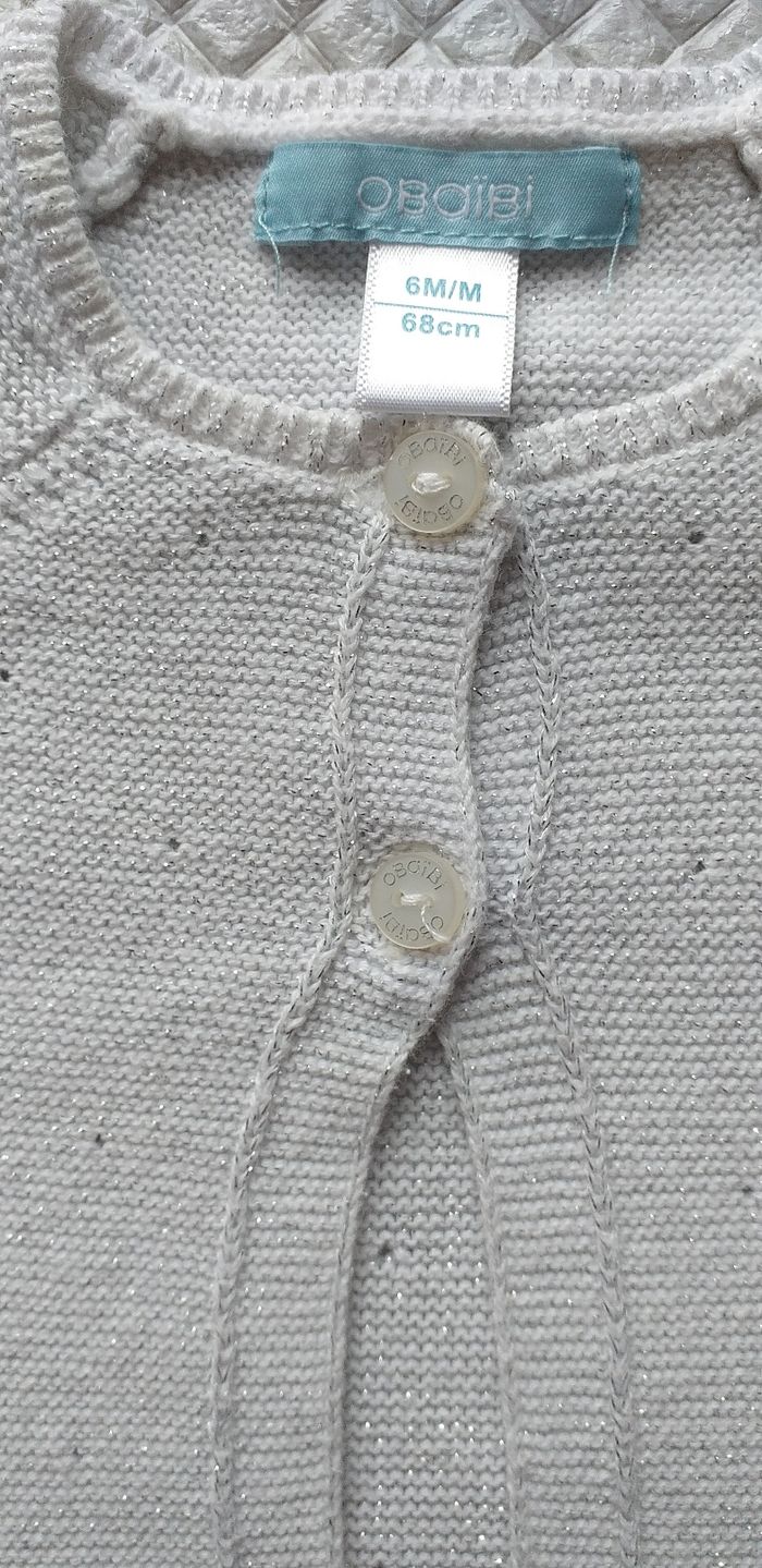 Gilet gris avec des paillettes. Fermeture par boutons. Bouton supplémentaire cousu sur l'étiquette.