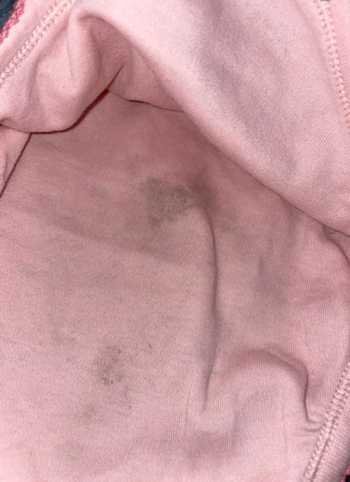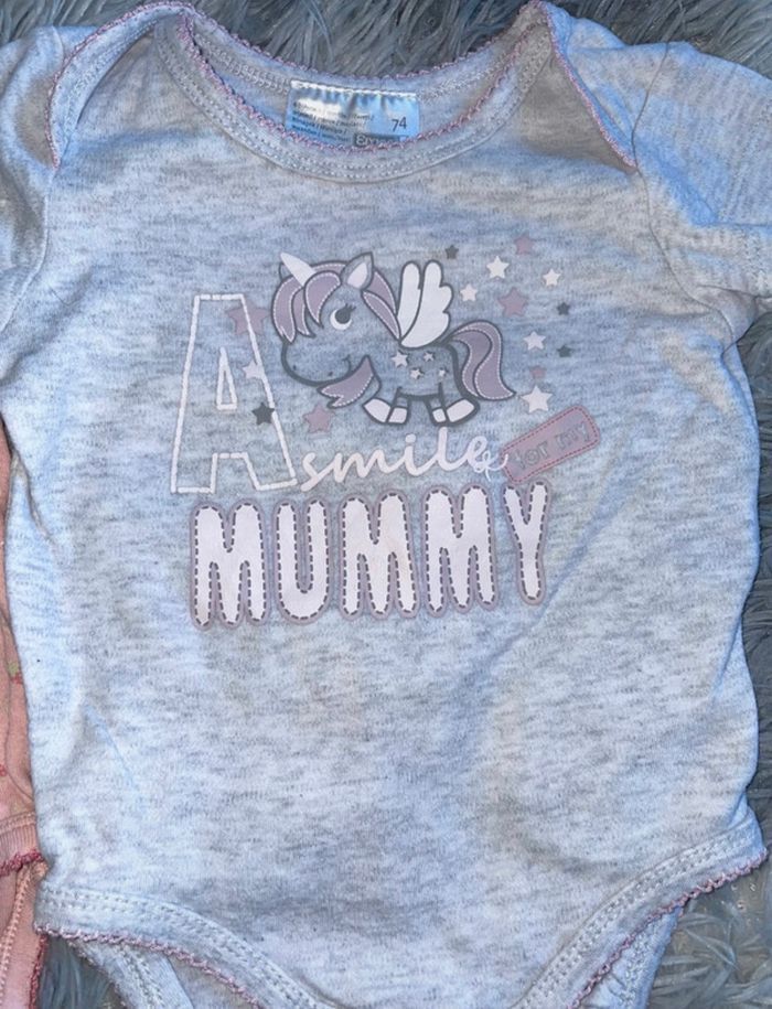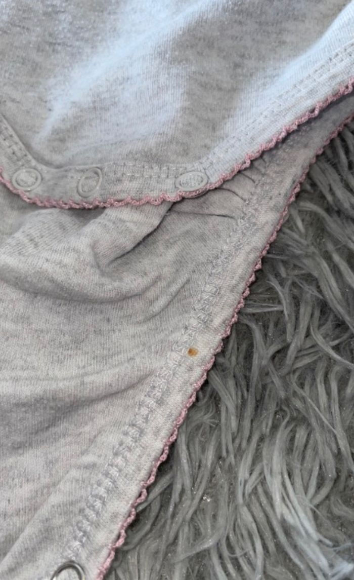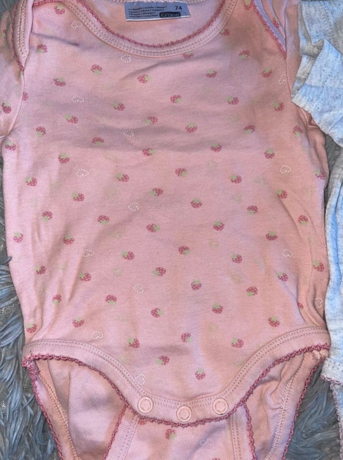 T Taille 6/9 mois le rose est taché à l’intérieur du body mais ne se voit pas à l’extérieur et une toute petite tache sur body gris