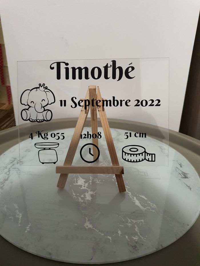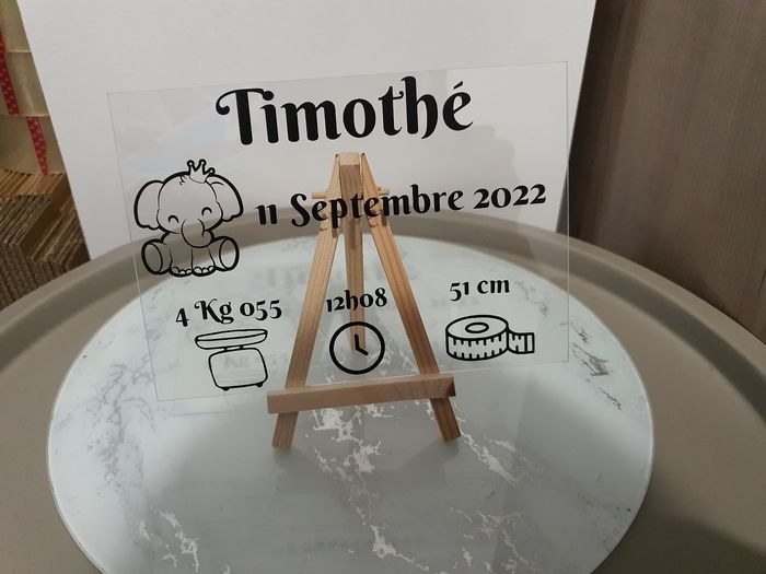 Plexiglass Naissance sur chevalet. Plexiglass personnalisée. Tableau de naissance plexiglass Merci de m'indiquer : - Le prénom - La date de naissance - L'heure de naissance - Le poids - La taille Dans la case personnalisation. Je vous propose un tableau de naissance en plexiglass entièrement personnalisable. La taille est de 18x12.7cm. Idéal pour offrir lors d'une naissance ou pour sublimer la chambre de votre bébé. Modèle éléphant ou autre si possible. Privilégier shop2shop