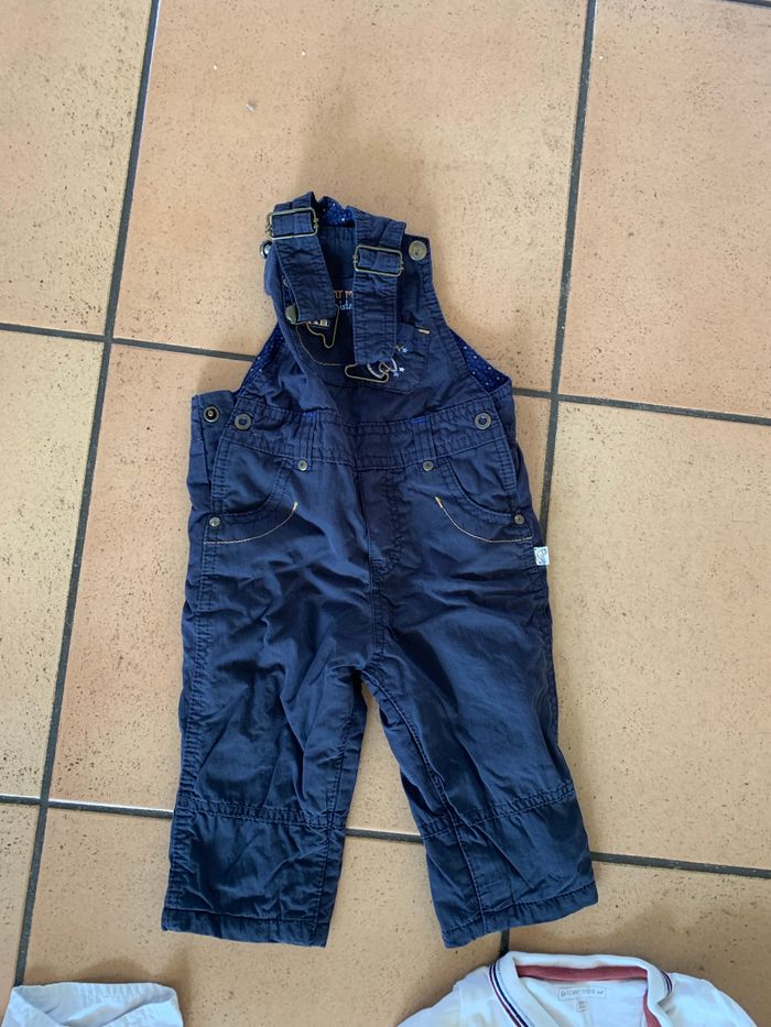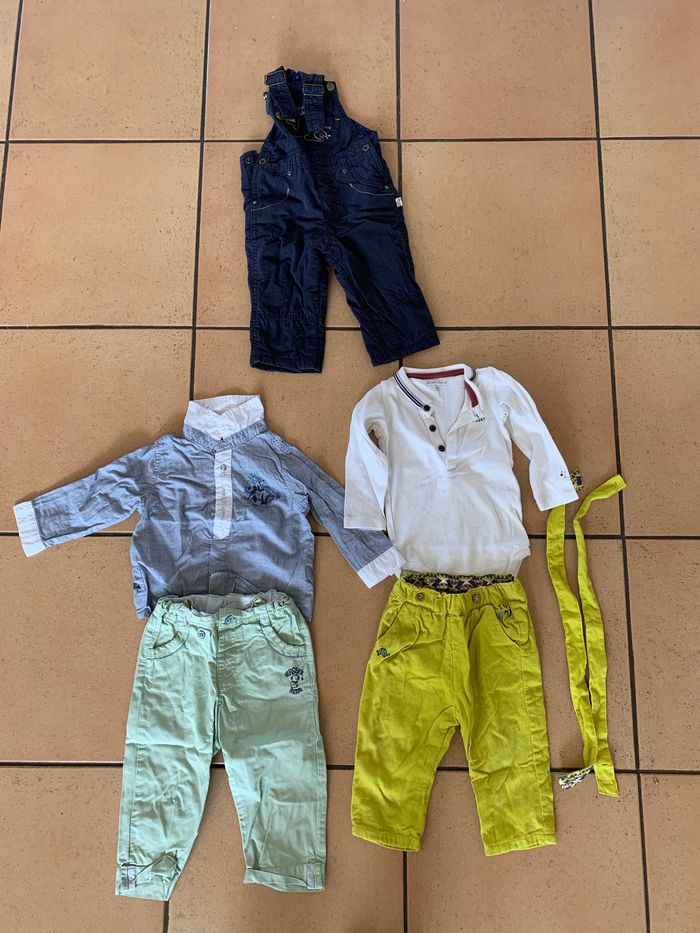 Lot contenant 1 ensemble pantalon + chemise 1 salopette 1 salopette /pantalon ( bretelles amovibles) 1 body avec col ( petite tache sur le body => voir photo) Très bon état (sauf le body)