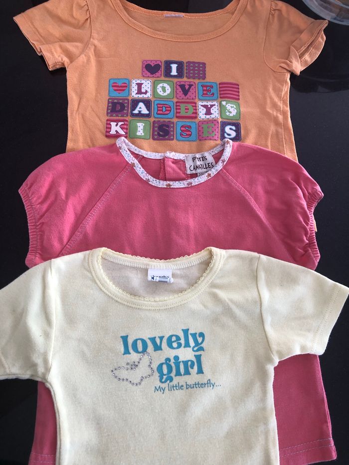 Lot de trois T-shirts, deux ans, un de marque absorba, l'autre petit canaille, le troisième, je ne me souviens plus le tout en très bon état, pas de taches pas de trou
