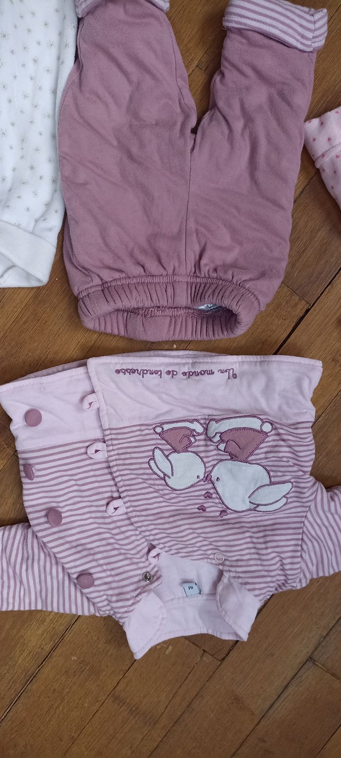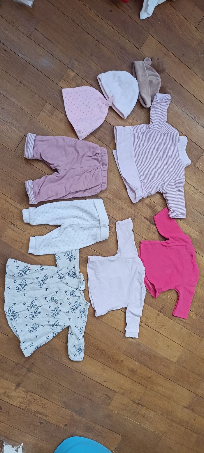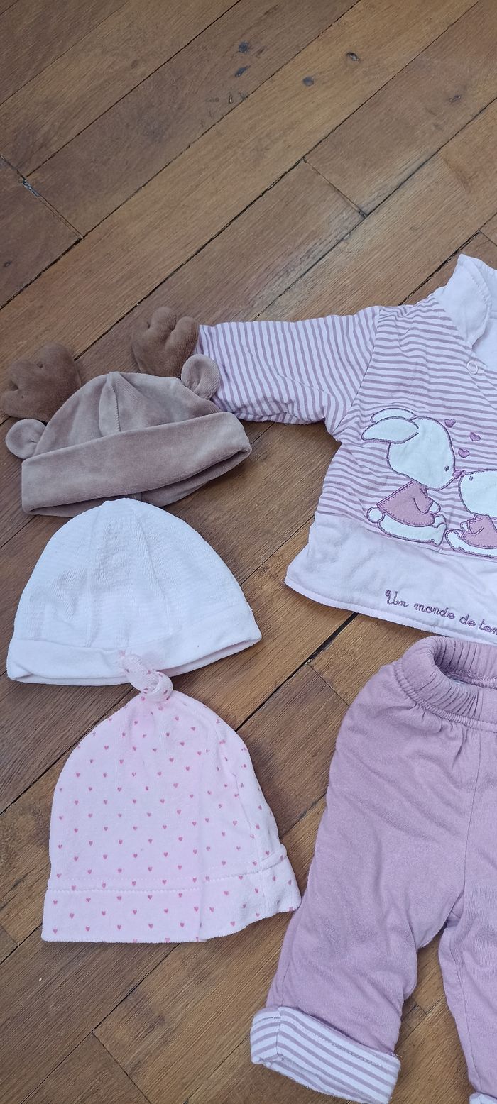 Lot 1 mois filles, comprenant trois bonnets ( le marron taille naissance), un ensemble violet un monde de tendresse un pantalon blanc avec des étoiles h&m( les étoiles commencent à partir), deux t-shirt manche longue rose obaidi et un t-shirt manches longues gris avec des dessins d'hiver tape à l'oeil.