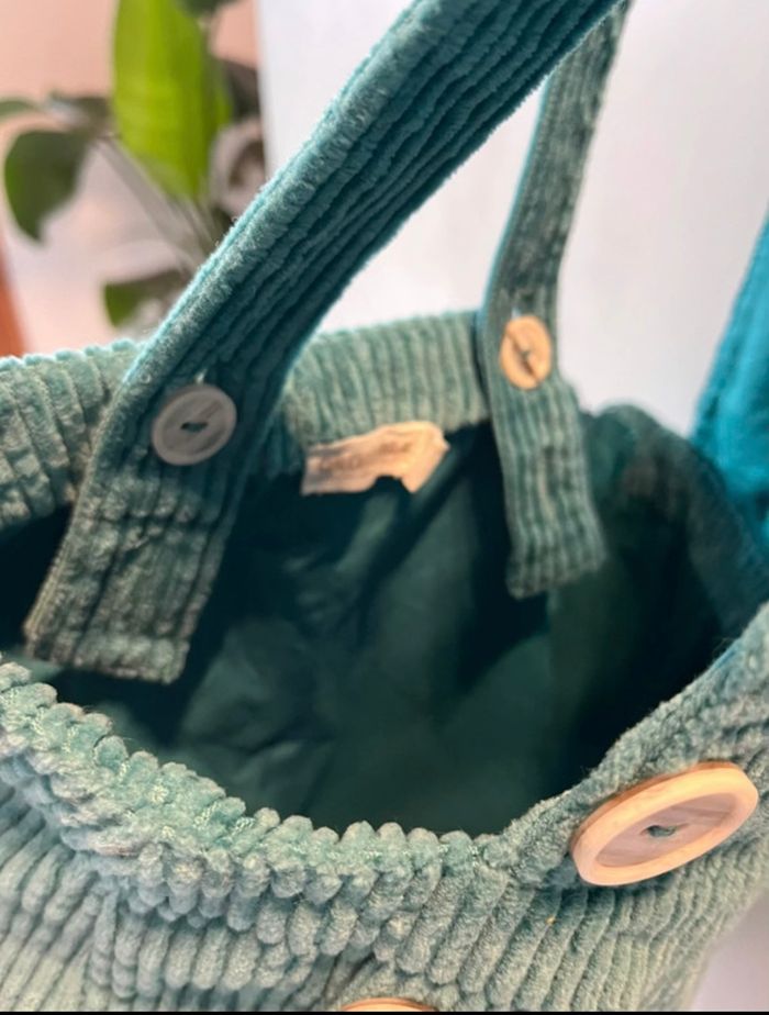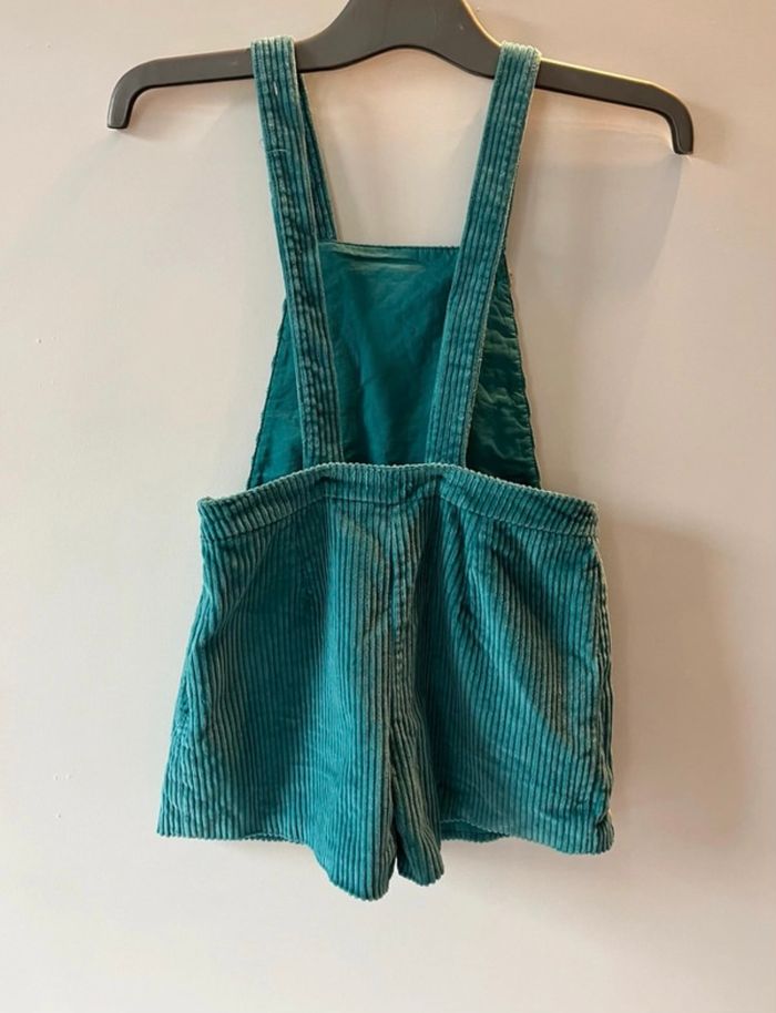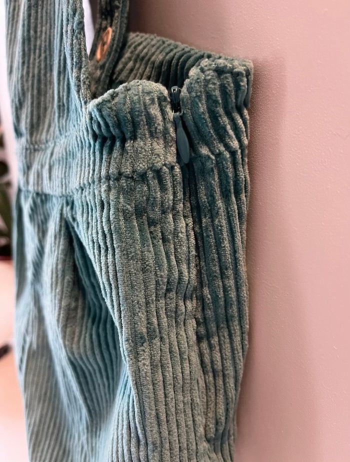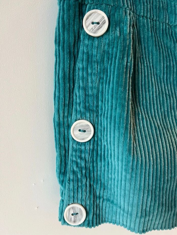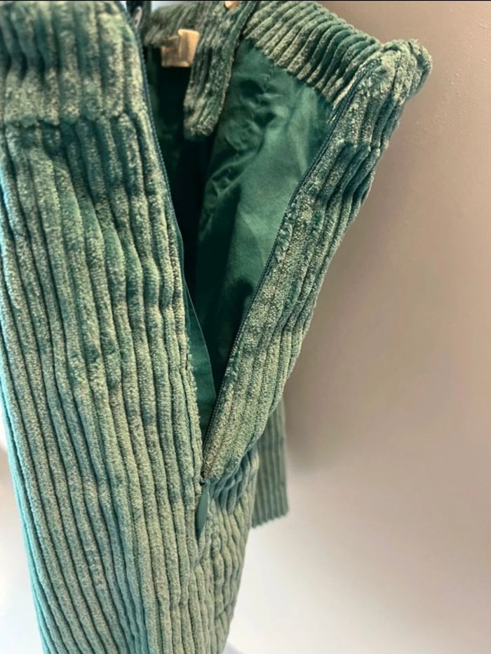 Salopette hyper tendance Doublure cotonnade Velours côtelé d’un beau vert Fermeture invisible sur la hanche Boutons effets marbrés décoratifs Bretelles fermées par un boutons à l’arrière Pinces devant jamais porté
