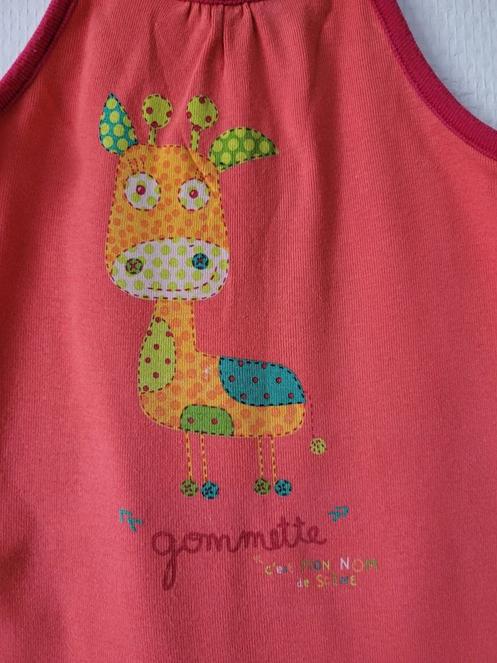 Combi-short corail de marque Du Pareil Au Même taille 18 mois Fines bretelles S'ouvre à l'entrejambe Dessin girafe sur le devant avec message "Gomette, c'est mon nom de scène " 100% coton En très bon état