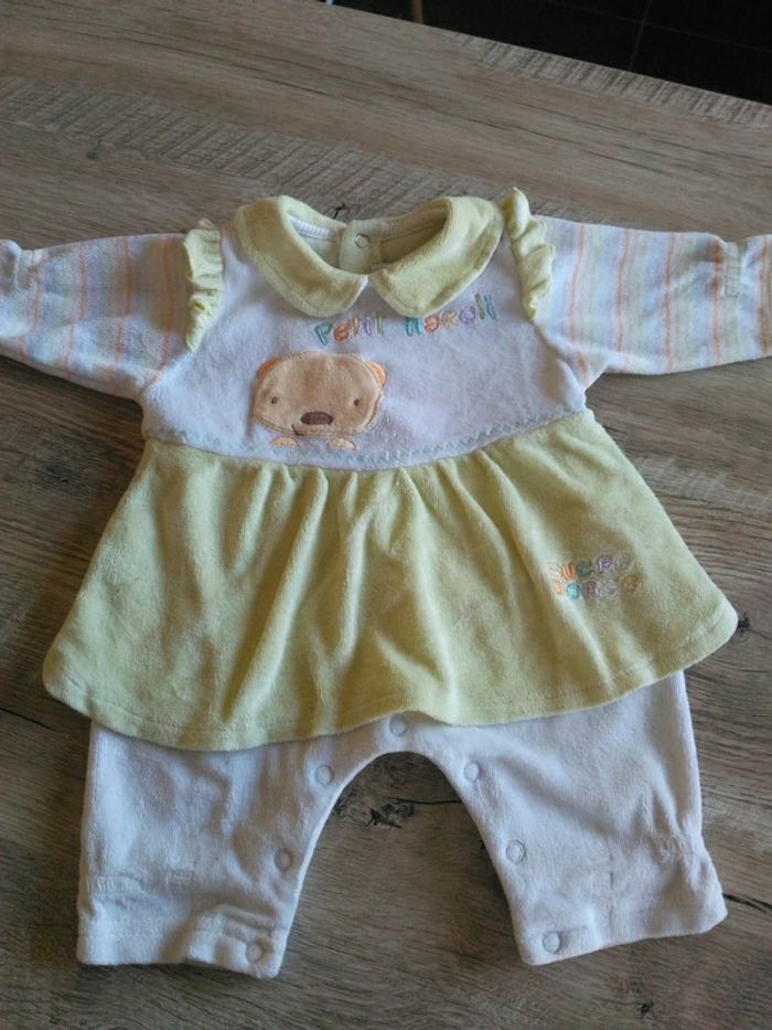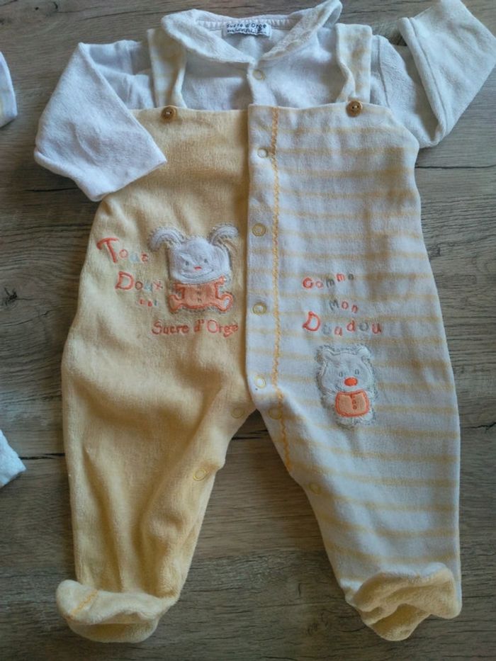 Pyjamas en très bon état, de marque Sucre d'Orge. 1 en taille naissance ( blanc et vert clair) 1 en taille 3 mois ( blanc et jaune)