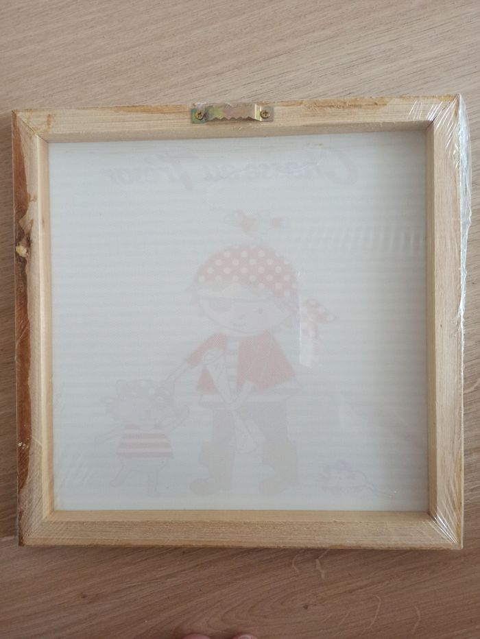 Toile décorative motif pirate pour chambre d'enfant. Elle est neuve et encore sous plastique. Mesure 25 cm par 25 cm. Possibilité de l'accrocher au mur.