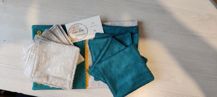 Pochette double fait main. 10 petites lingettes très douces pour nettoyer son visage. Tout est neuf.