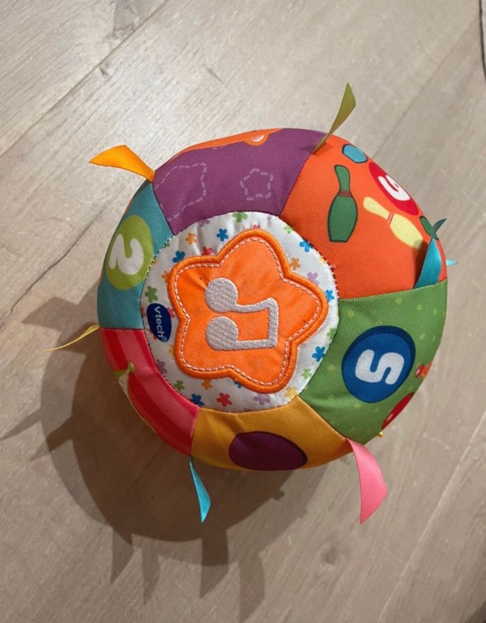 Une balle colorée, interactive et musicale. Une balle toute légère qui déclenche chansons et sons rigolos dès qu'on la lance ou qu'on la fait rouler (détecteur de mouvement). Un gros bouton orange en forme d'étoile sur le dessus de la balle pour déclencher des chansons, mélodies et apprentissages sur les animaux et les premiers chiffres. 6 faces pour apprendre les chiffres avec les P'tits copains au cirque. 15 mélodies et 5 chansons. Lavable en machine (module électronique détachable).