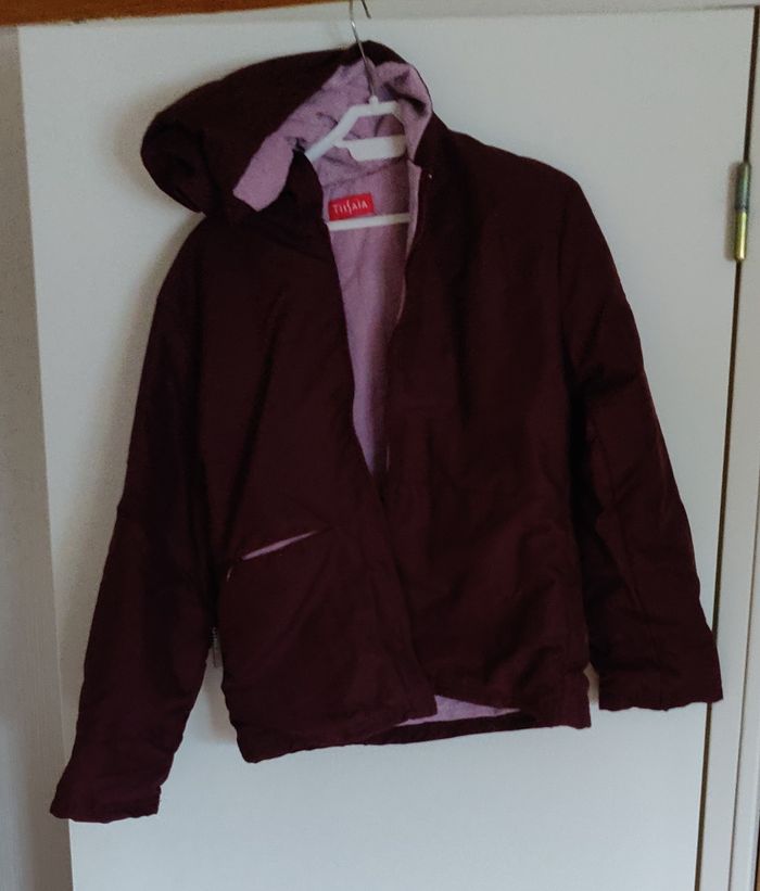 Blouson fille en taille 138 (10 ans) Matière polyester et doublure en coton Marque Tissaia Couleur bordeaux et doublure intérieure lila