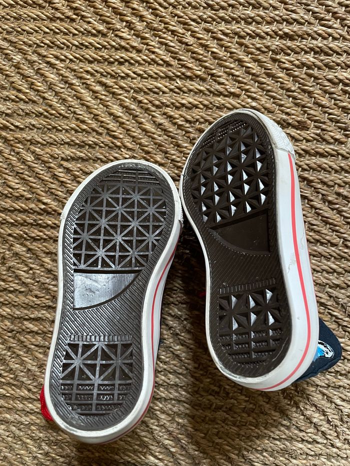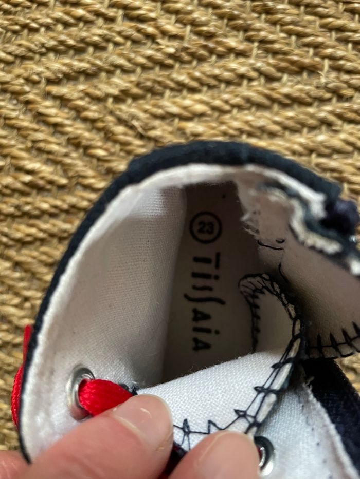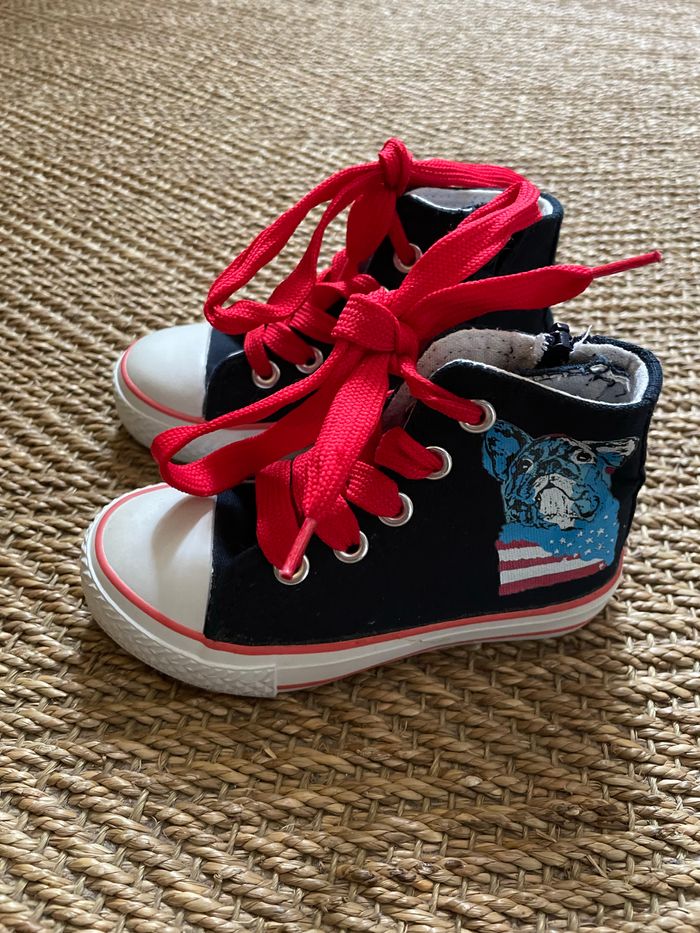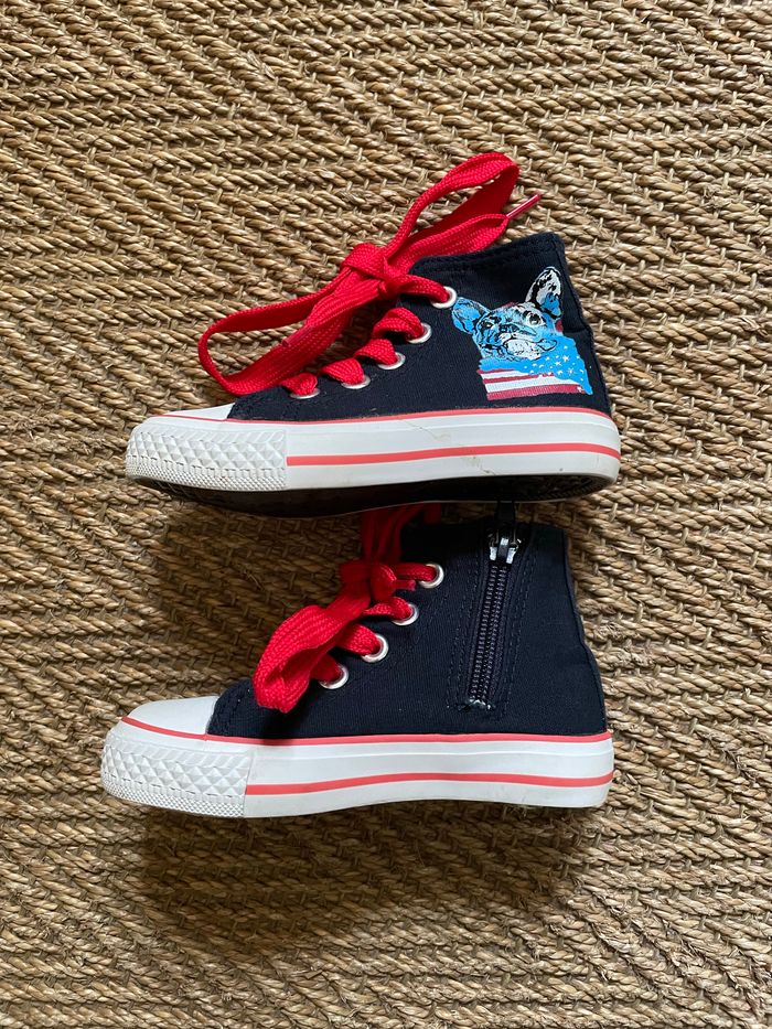 Neuves Essayées 1 fois Sérigraphie bulldog Très légèrement frottées aux talons sinon comme neuves À lacets et fermeture éclair En toile