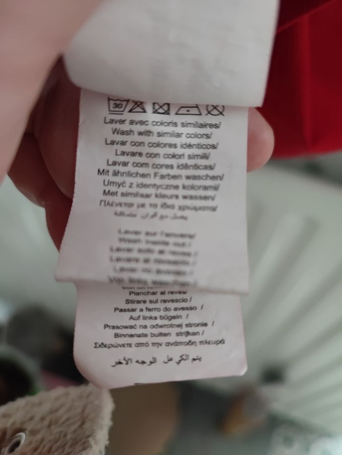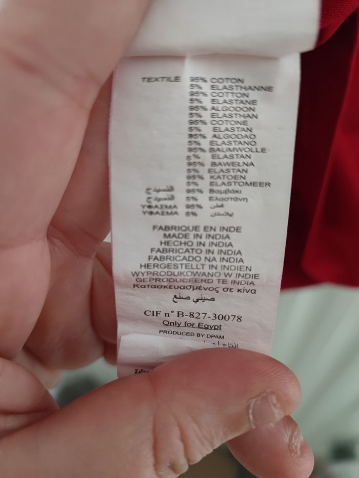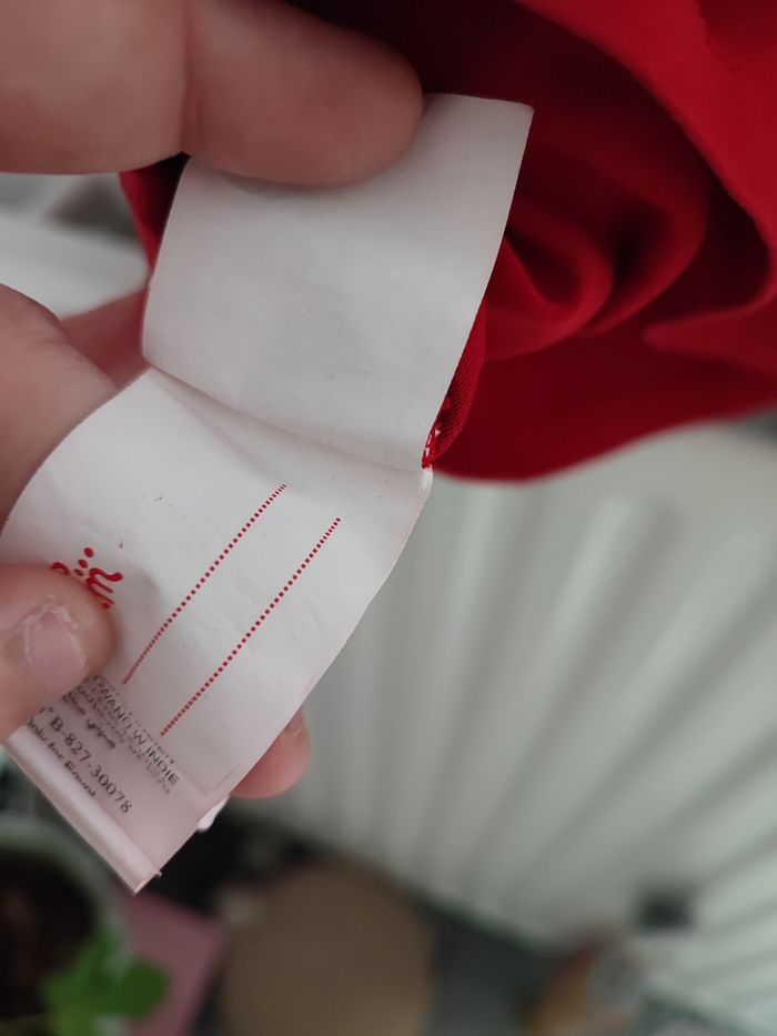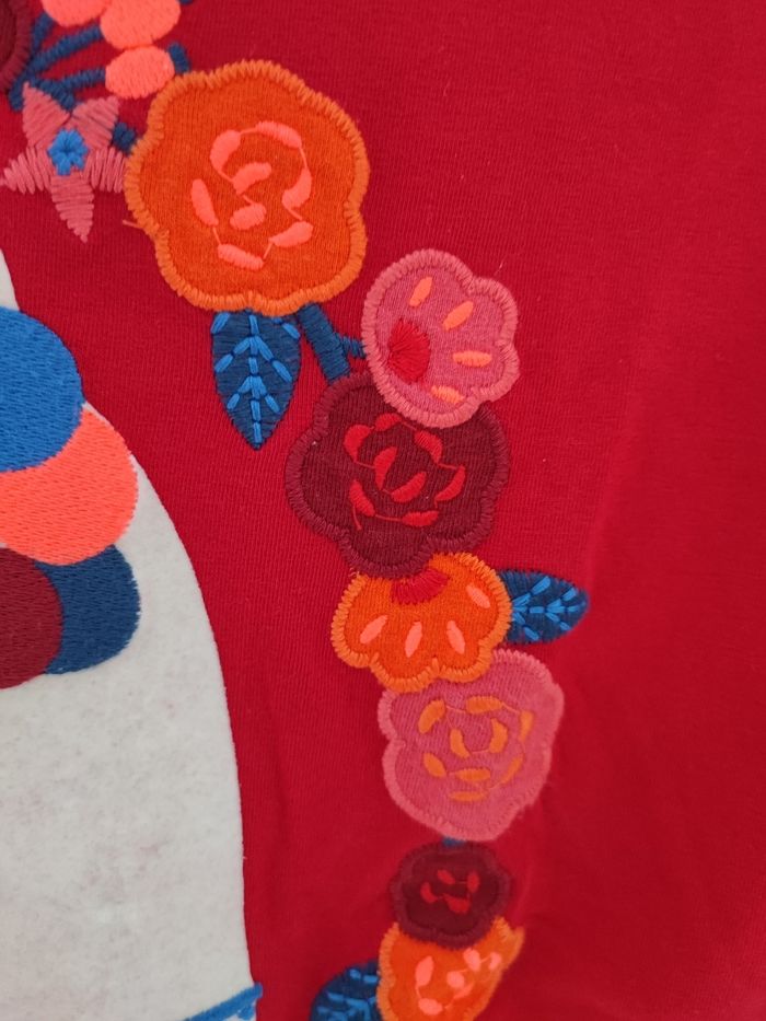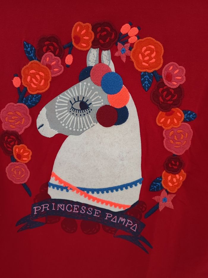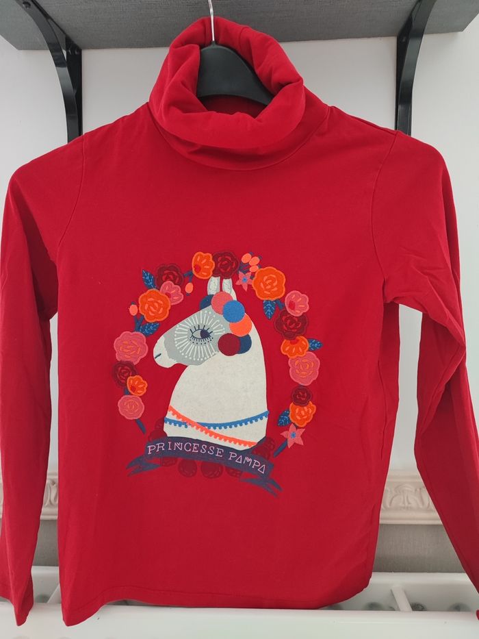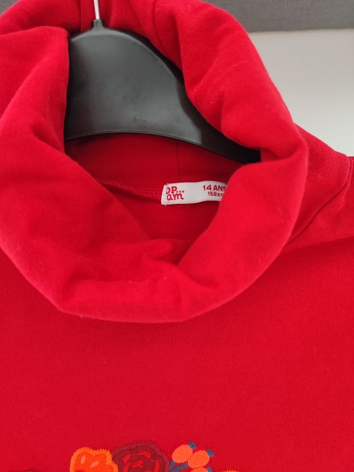 De couleur rouge (moins flashy que sur la photo) Jamais porté,col montant imprimé lama avec fleurs multicolores Du pareil au même taille 14 ans