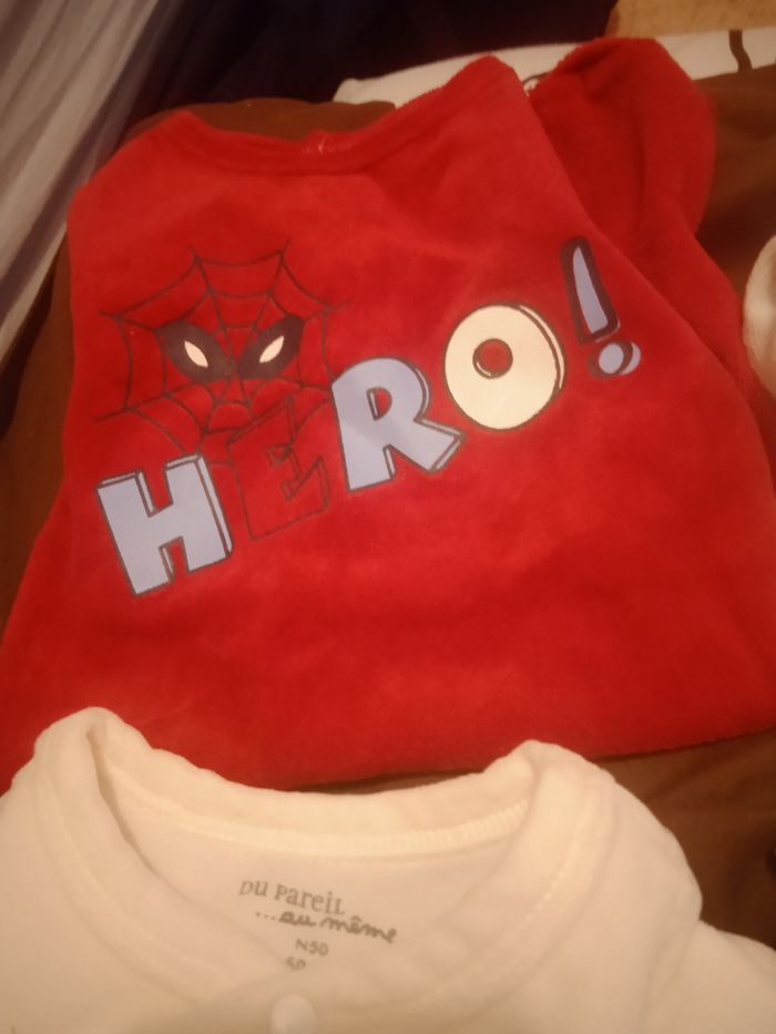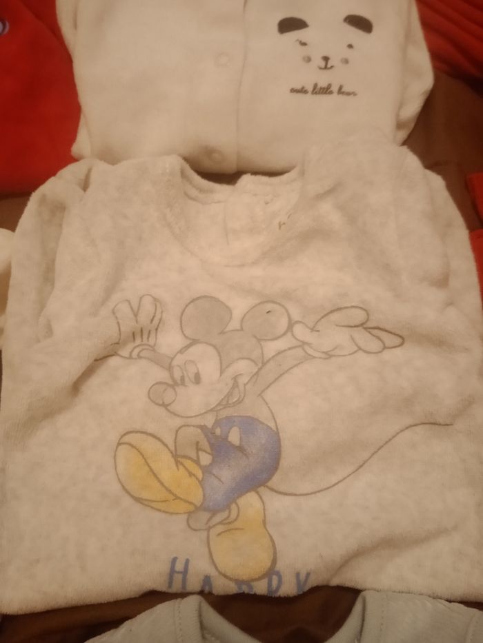 Lot avec 6pyjamas Il y a 5 pyjamas naissance et 1 pyjama en 1 mois (voir les photos) Le pyjama bleu sans manche, le rouge ''hero!'' Mickey Le blanc avec le koala et le panda sont neufs le 1mois orchestra et celui de Kiabi sont de seconde main