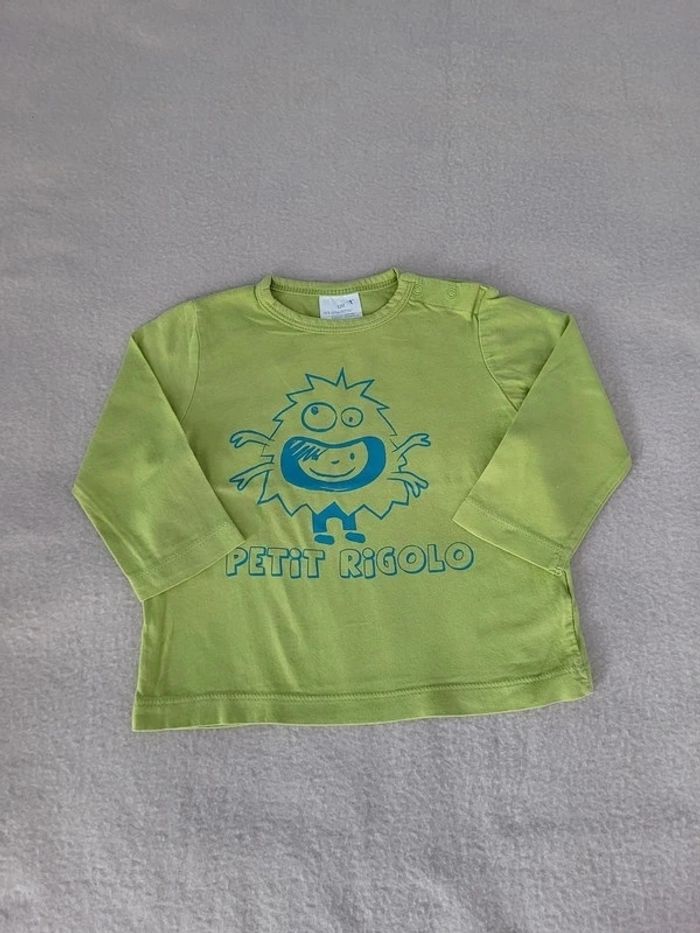 t-shirt manches longues 12 mois vert, "petit rigolo", 100 % coton en très bon état