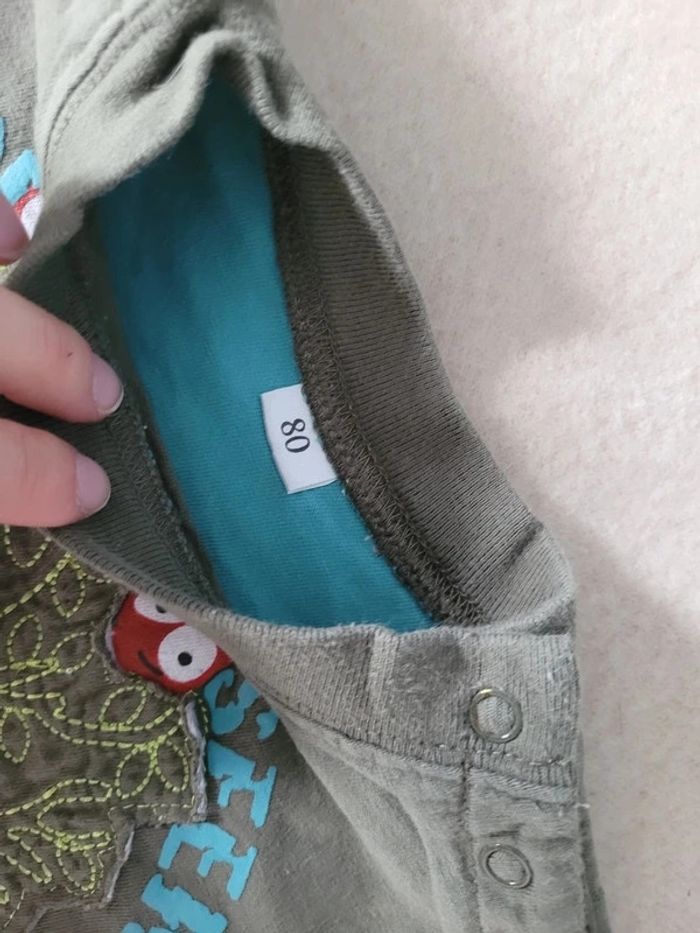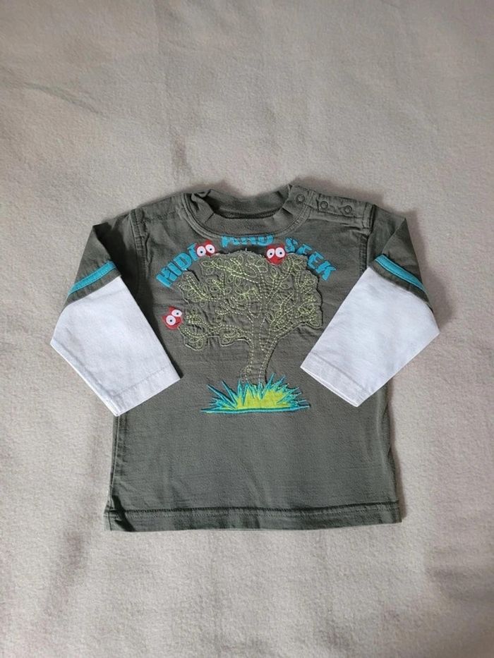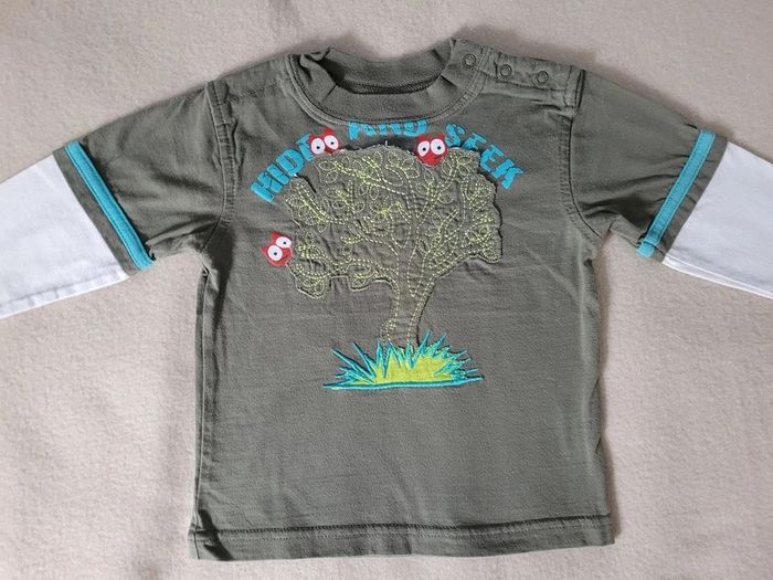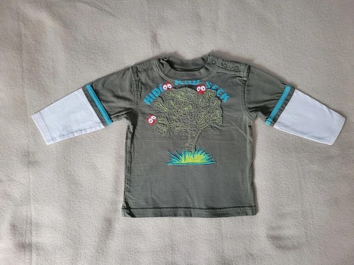 t-shirt manches longues 80 cm marron/kaki et bleu et blanc en très bon état