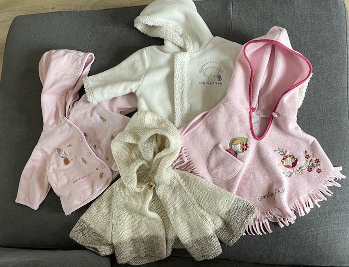 Une veste, un manteau et 2 ponchos, taille 0-1mois (1 mois qui peux être utilisé pour un nouveau né) 🎀 #veste #manteau #ponchos #naissance #fille