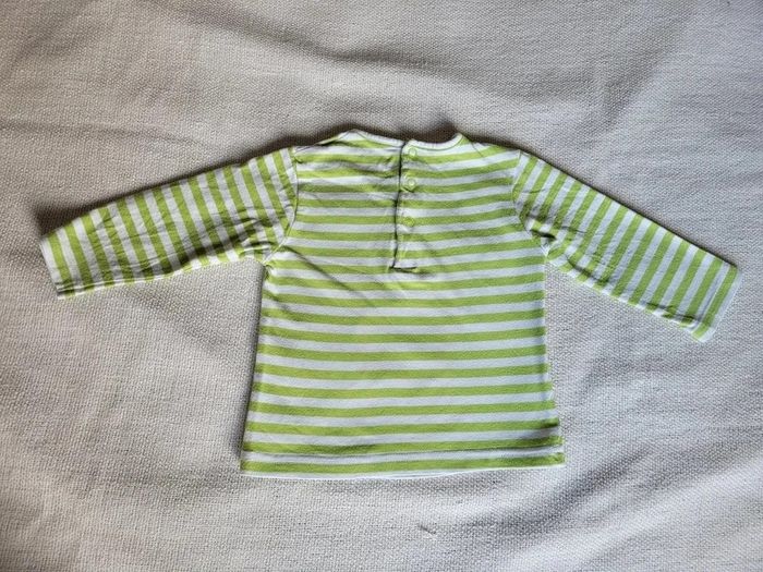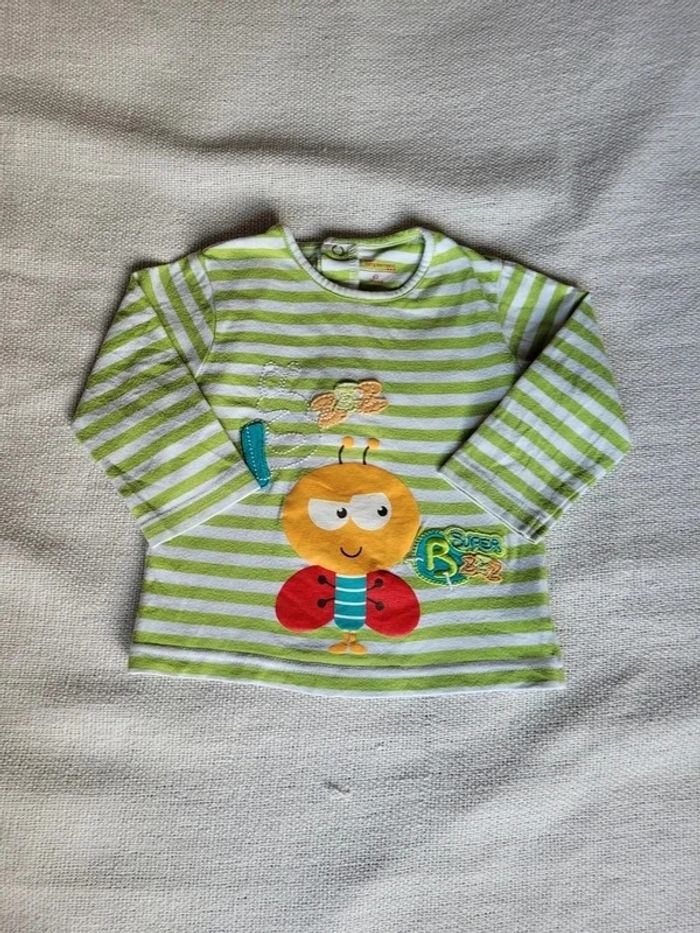 t-shirt manches longues 12 mois "tout simplement" en très bon état vert rayé blanc motif abeille