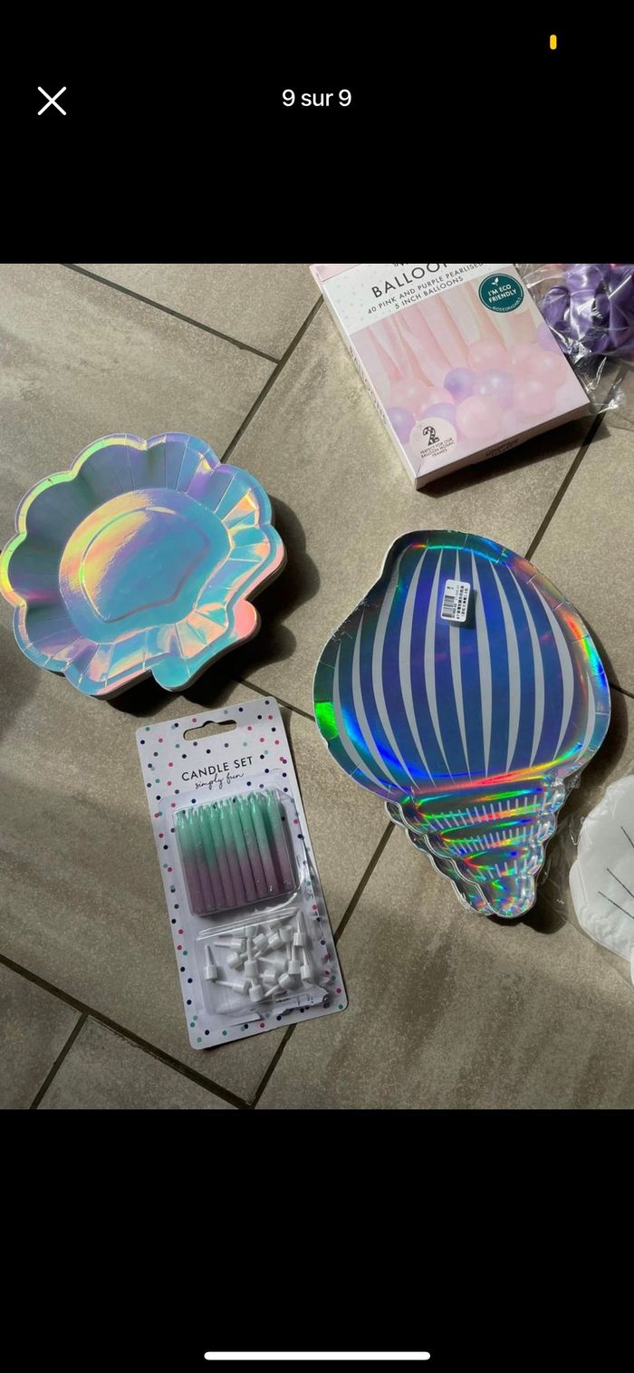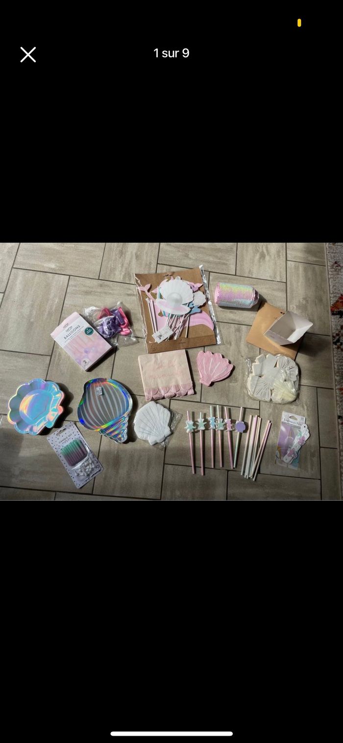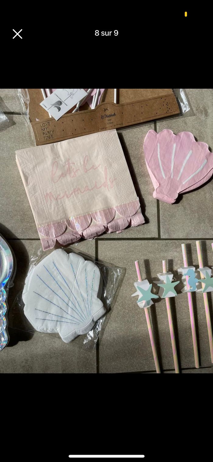 Je vends diverses décorations / accessoires pour un anniversaire sur le thème sirène/ océan et quelques une sur le thème arc en ciel. Tout est noté en détail ci dessous avec les tarifs , possibilité de lot. D’autres photos plus en détails possibles Déco sirène : - 14 pailles + 14 décos de paille 3€ - 16 petites assiettes coquillage 5€ - 16 assiettes coquillage encore emballées 8€ - 35 boites coquillage 15€ - 8 boites popcorn 4€ - 18 bougies 2€ - Kit photobooth encore emballé 10€ - Chemin de table 3m 5€ - 16 Serviettes roses coquillage 2€ - 20 serviettes blanches neuves 4€ - 14 Serviettes roses carrées 2€ - petits ballons rose et violet (15 de chaque couleur) idéal pour remplir déco queue de sirène et coquillage 5€ -guirlande happy birthday (R un peu abîmé) 2€ -guirlande coquillage 5€ Déco arc en ciel -16 serviettes + 6 pics 3€ -support gâteaux 10€ -guirlande 5€
