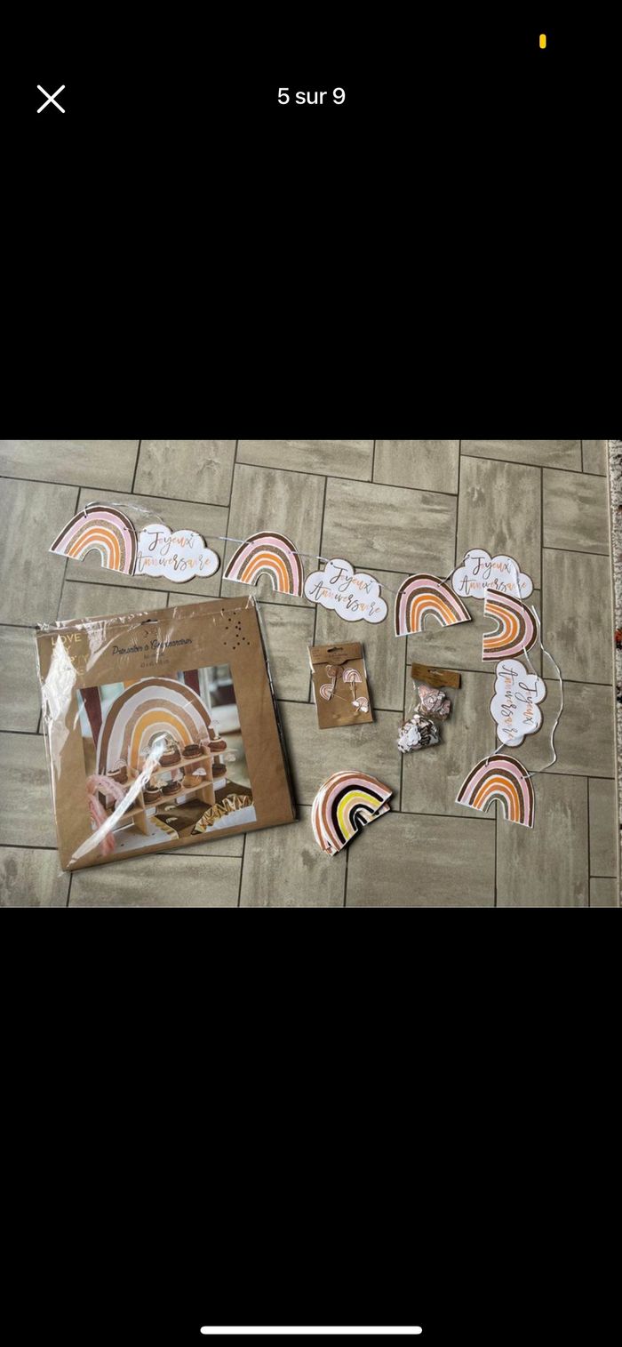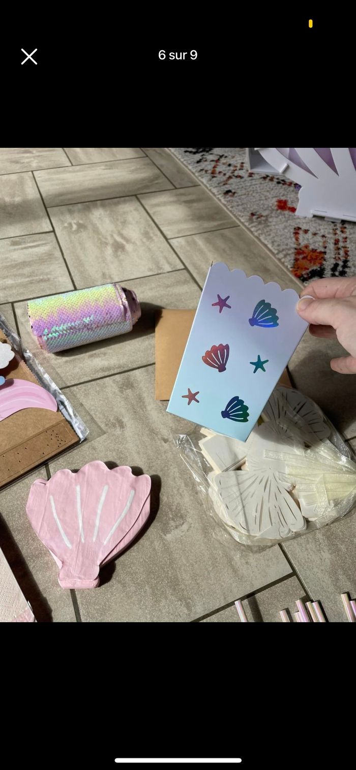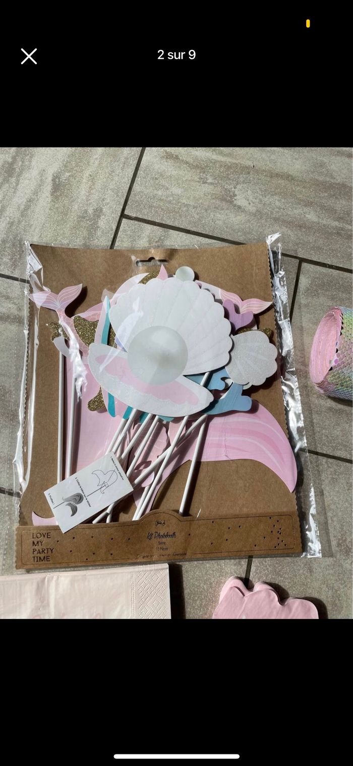 Je vends diverses décorations / accessoires pour un anniversaire sur le thème sirène/ océan et quelques une sur le thème arc en ciel. Tout est noté en détail ci dessous avec les tarifs , possibilité de lot. D’autres photos plus en détails possibles Déco sirène : - 14 pailles + 14 décos de paille 3€ - 16 petites assiettes coquillage 5€ - 16 assiettes coquillage encore emballées 8€ - 35 boites coquillage 15€ - 8 boites popcorn 4€ - 18 bougies 2€ - Kit photobooth encore emballé 10€ - Chemin de table 3m 5€ - 16 Serviettes roses coquillage 2€ - 20 serviettes blanches neuves 4€ - 14 Serviettes roses carrées 2€ - petits ballons rose et violet (15 de chaque couleur) idéal pour remplir déco queue de sirène et coquillage 5€ -guirlande happy birthday (R un peu abîmé) 2€ -guirlande coquillage 5€ Déco arc en ciel -16 serviettes + 6 pics 3€ -support gâteaux 10€ -guirlande 5€