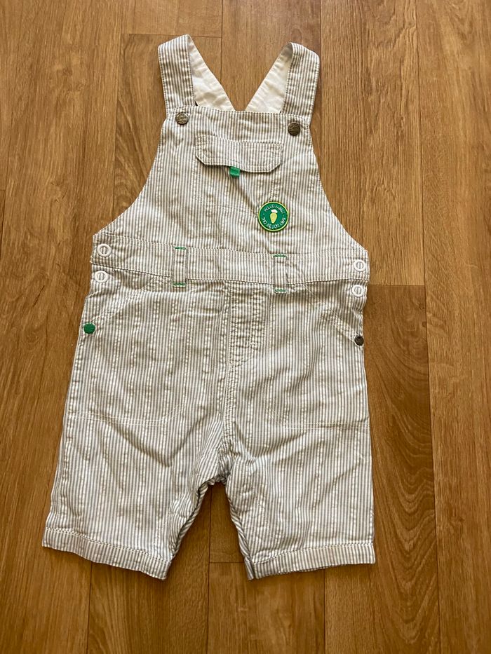 Je vends cette salopette pour garçon à rayures vert et blanc ainsi que son t-shirt vert Coton