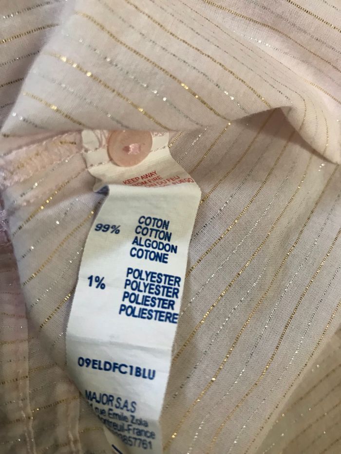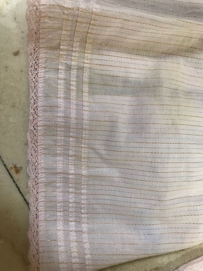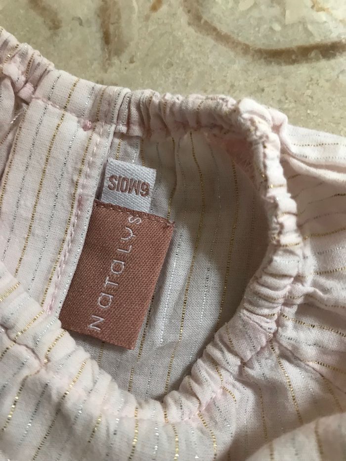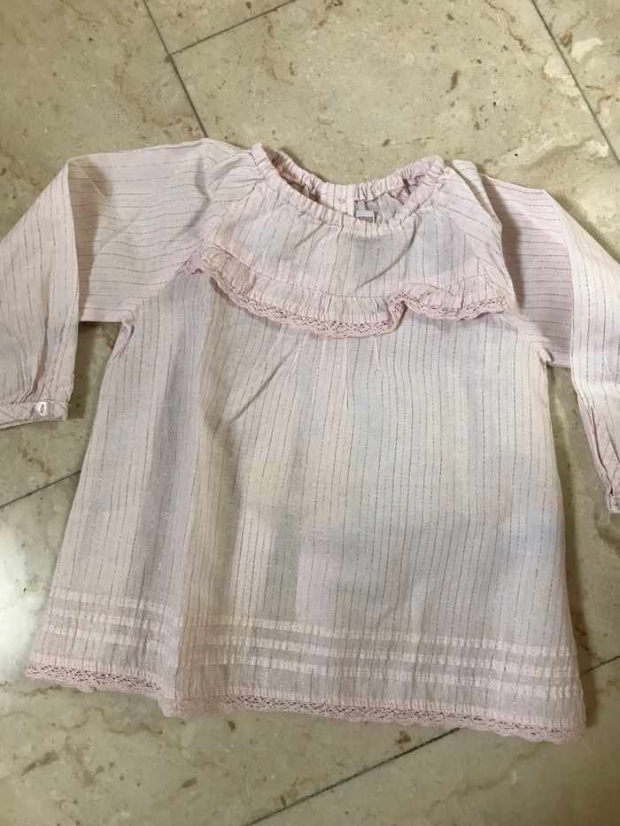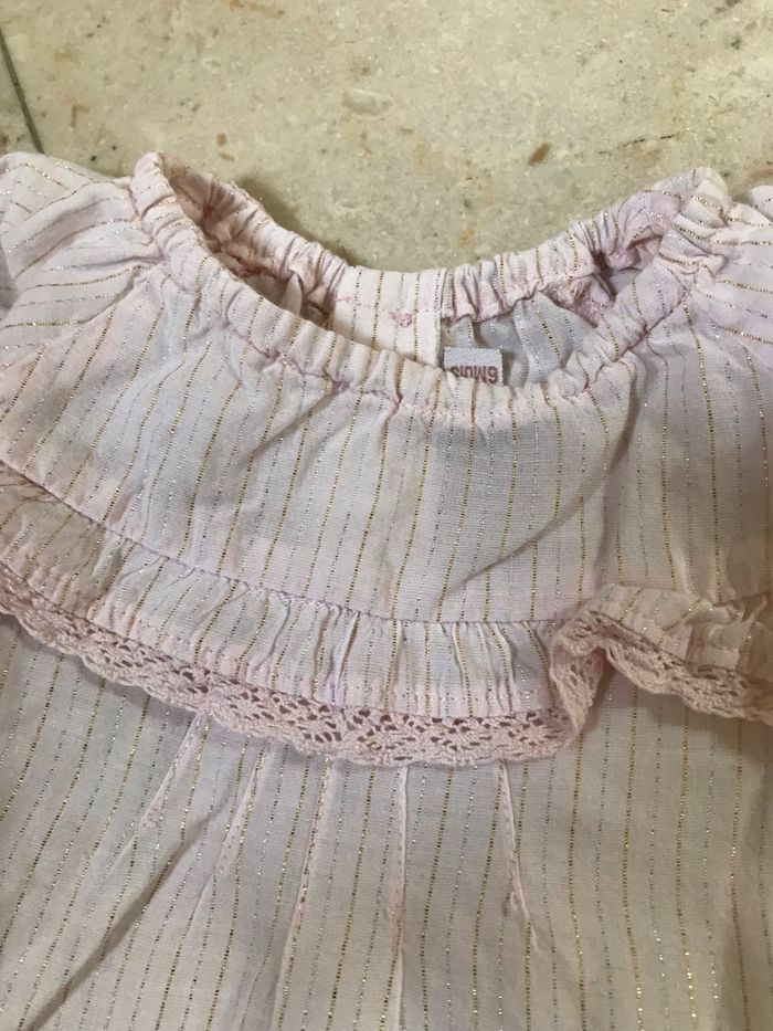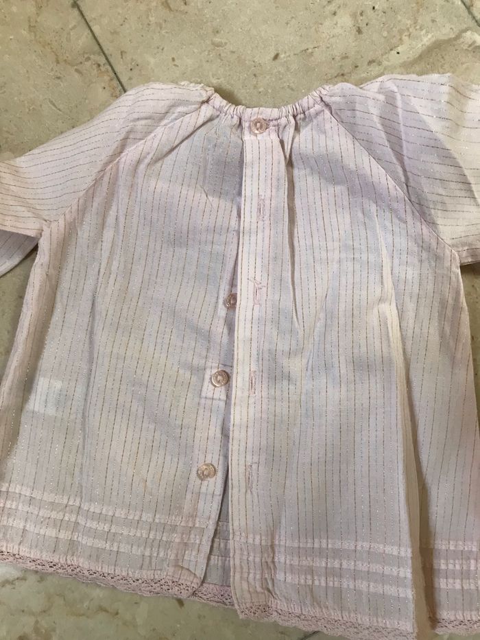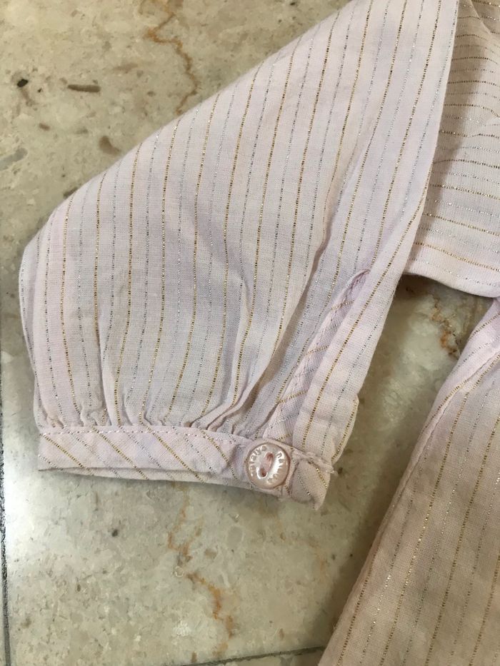 Blouse en tissu très léger de couleur très pâle et petites rayures très fines Manches longues resserrées au poignet par un biais et ouverture Encolure ronde avec élastique très souple qui permet de conserver une jolie encolure Entièrement boutonnée au dos Petit empiècement avec dentelle rose, idem au bas ce cette blouse Composition : 99 % coton et 1 % polyester Très bon état NARALYS 6 Mois