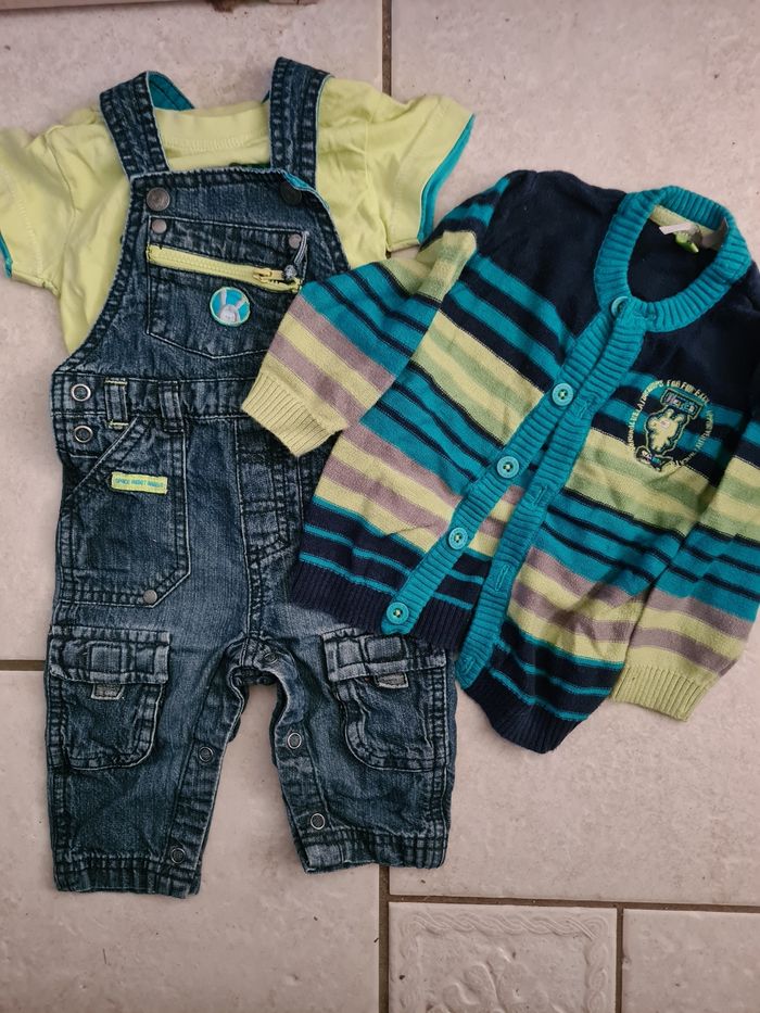Ensemble garçon composé d'une salopette en jean, d'un tee-shirt et d'un gilet en très bonne état de chez orchestra taille 6 mois 67 cm