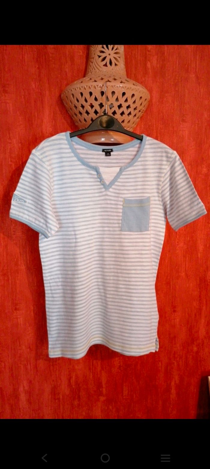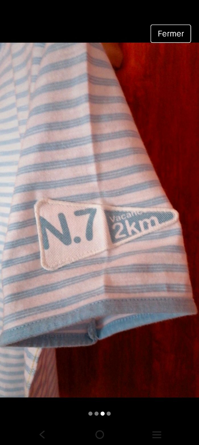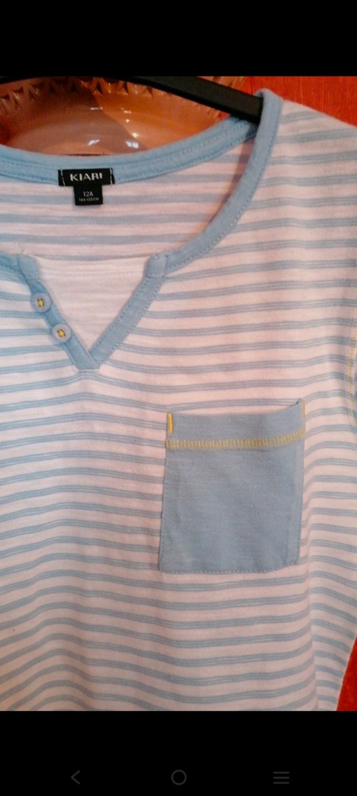 Taille 12ans (144-155cm) Bleu ciel et blanc 100% coton Poche poitrine Écusson sur manche droite Petites fentes sur le bas du t-shirt