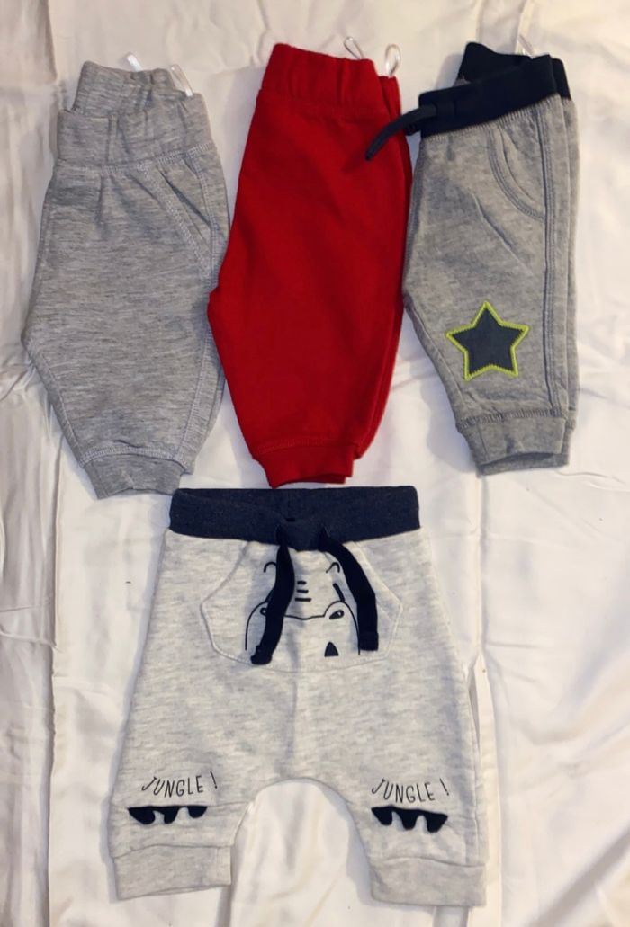 Les 3 premiers joggings sont de C&A (62 cm). Le 4ème jogging viens de Kiabi (3mois/56-62 cm/6kg) Ils ont été porté 1/2 fois.
