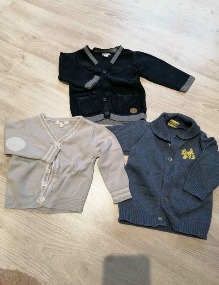 Les 2 gilets bleus 6 mois, le gris petit 9 mois plus un 6 mois