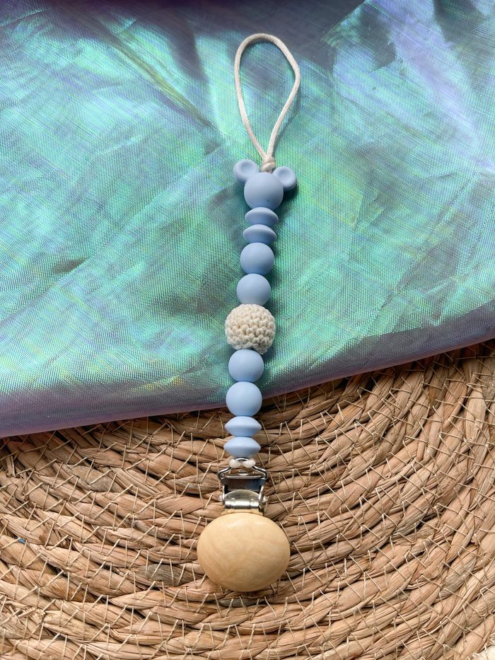 Attache-tétine bleu à perle blanche brodé, fait mains par une maman passionnée par les accessoires bébé.