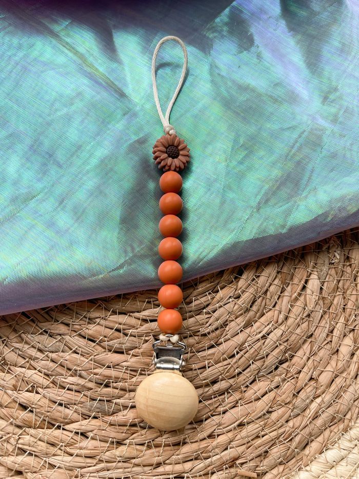 Attache sucette orange Teracota fait mains par une maman passionnée par les accessoires bébé.