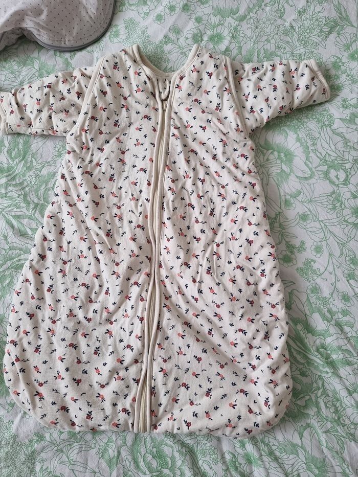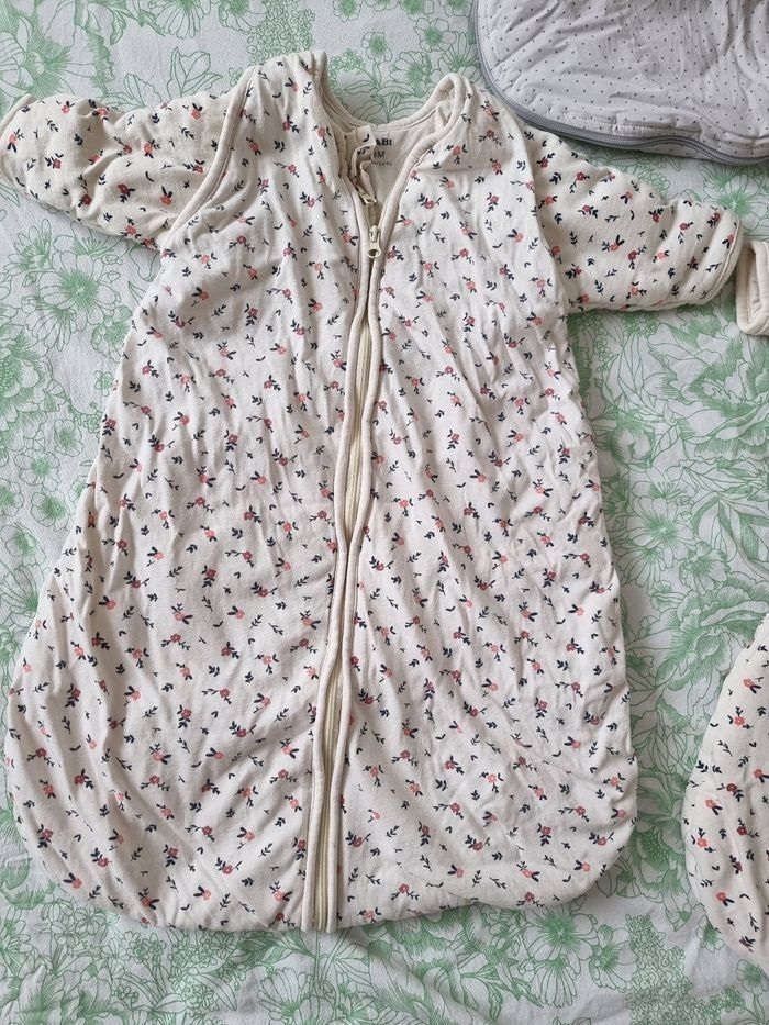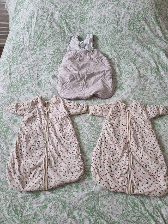 Vends lot de 3 gigoteuses 1ère en très bonne état 2ème fleuris état passable 3ème grise en très bonne état. Taille 0/6 mois les 3 Marque kiabi